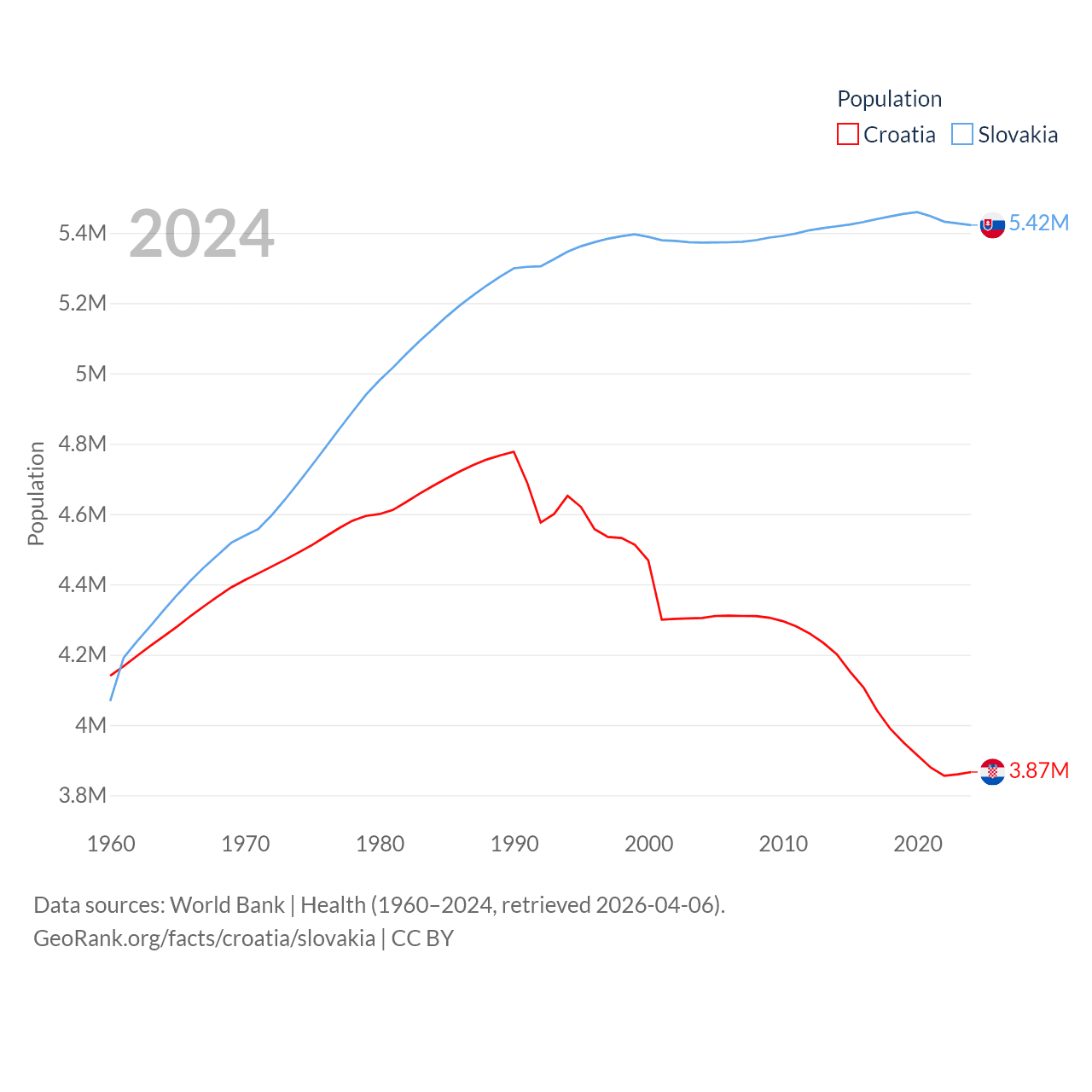 Croatia has a population of 3.87M (ranked 129/197), compared with 5.42M in Slovakia (ranked 119/197). Croatia's land area is 21,606 sq mi versus 18,564 sq mi for Slovakia (ranked 123rd vs. 128th).