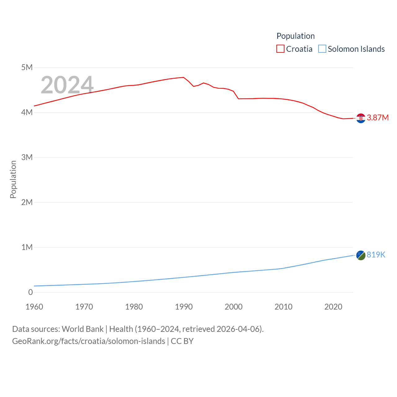 Croatia has a population of 3.87M (ranked 129/197), compared with 819K in The Solomon Islands (ranked 162/197). Croatia's land area is 21,606 sq mi versus 10,807 sq mi for The Solomon Islands (ranked 123rd vs. 141st).