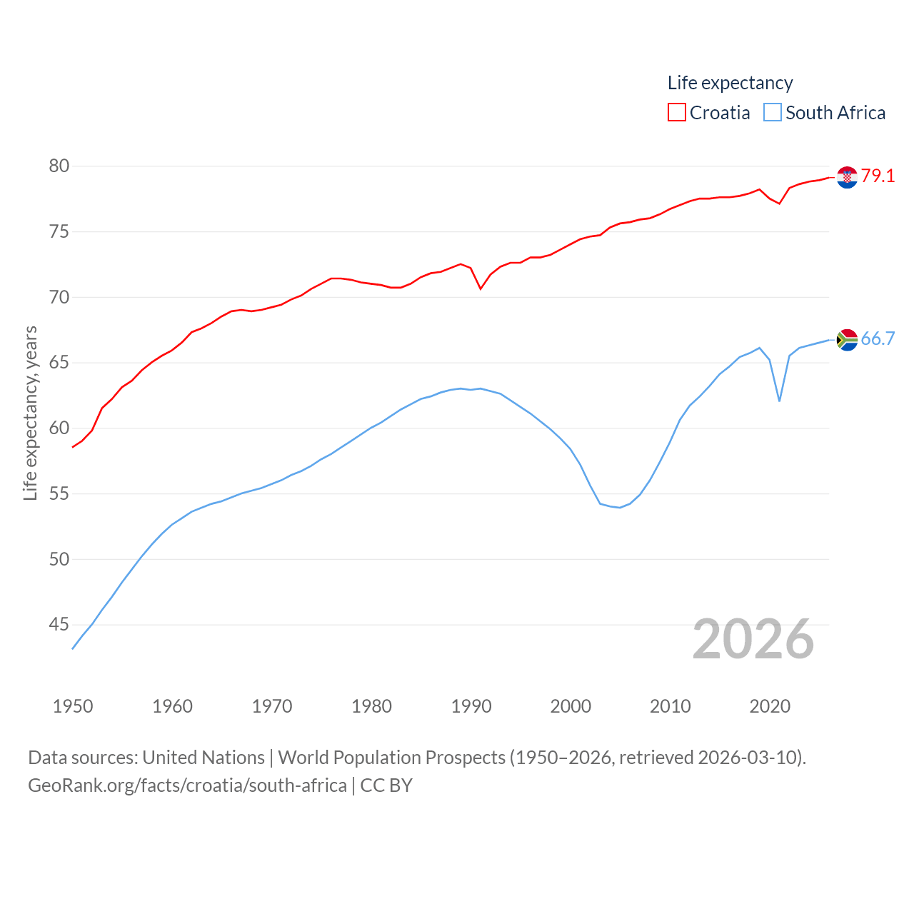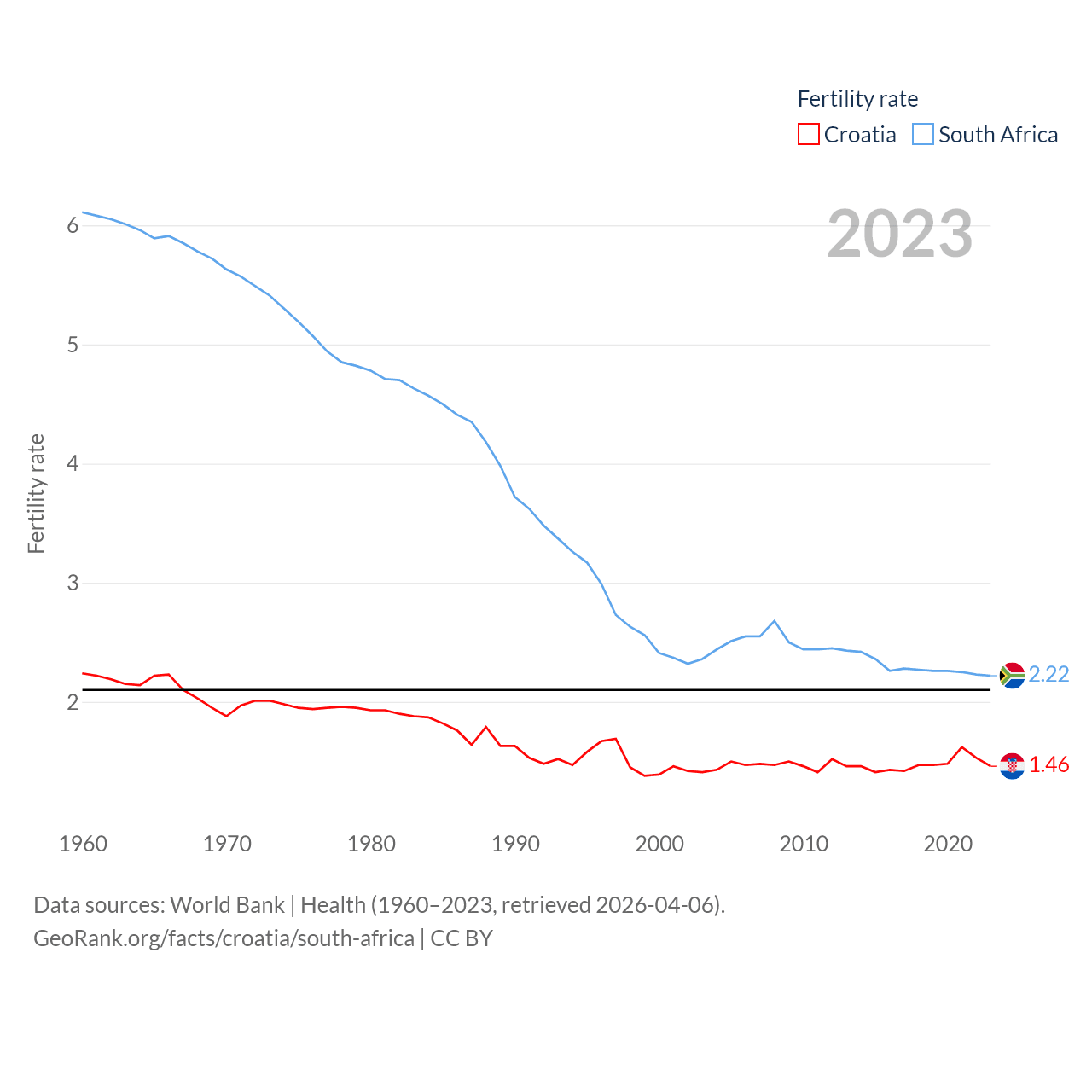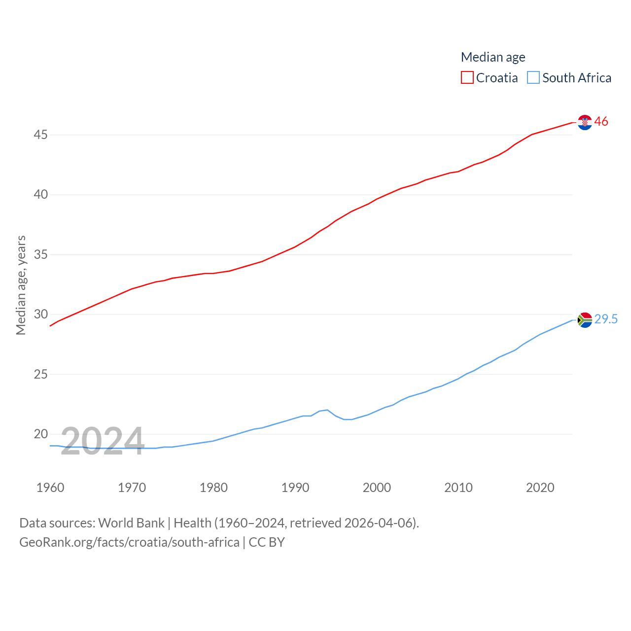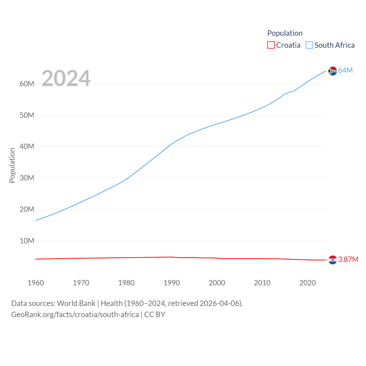 Croatia has a population of 3.87M (ranked 129/197), compared with 64M in South Africa (ranked 24/197). Croatia's land area is 21,606 sq mi versus 468,377 sq mi for South Africa (ranked 123rd vs. 24th).