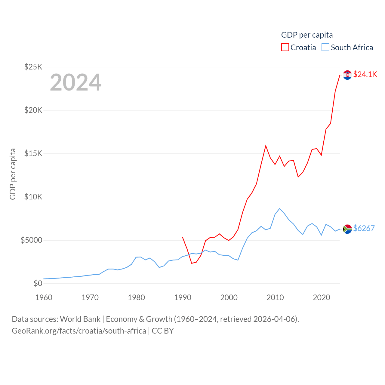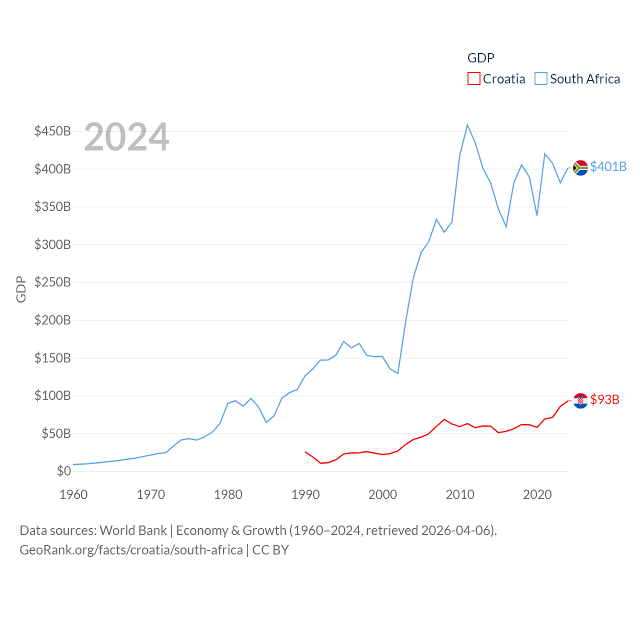 By GDP, Croatia ranks 75/197 ($93B) and South Africa ranks 40/197 ($401B). By GDP per capita, Croatia ranks 50/197 ($24,050), while South Africa ranks 111/197 ($6,267).