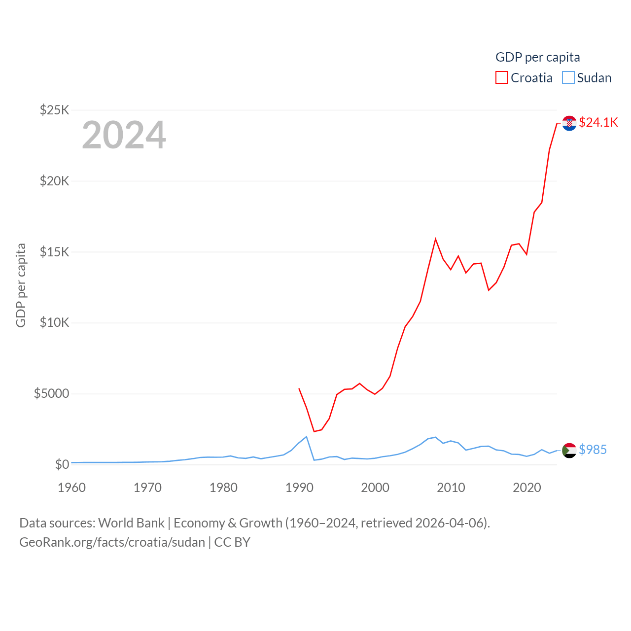 By GDP, Croatia ranks 75/197 ($93B) and Sudan ranks 94/197 ($49.7B). By GDP per capita, Croatia ranks 50/197 ($24,050), while Sudan ranks 179/197 ($985).