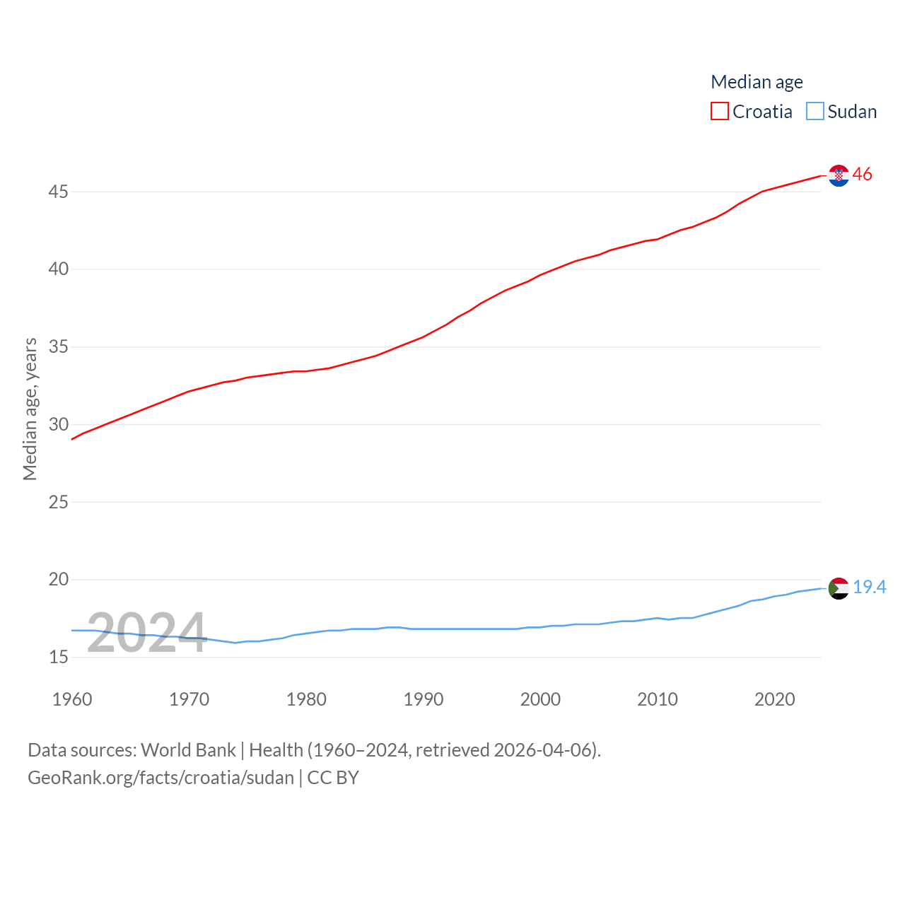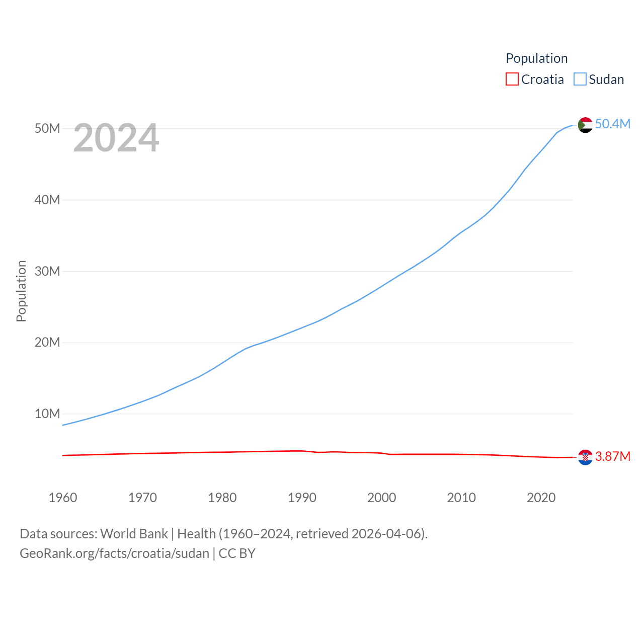 Croatia has a population of 3.87M (ranked 129/197), compared with 50.4M in Sudan (ranked 30/197). Croatia's land area is 21,606 sq mi versus 721,239 sq mi for Sudan (ranked 123rd vs. 15th).