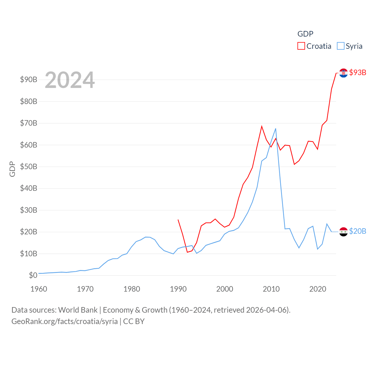 By GDP, Croatia ranks 75/197 ($93B) and Syria ranks 129/197 ($20B). By GDP per capita, Croatia ranks 50/197 ($24,050), while Syria ranks 185/197 ($847).