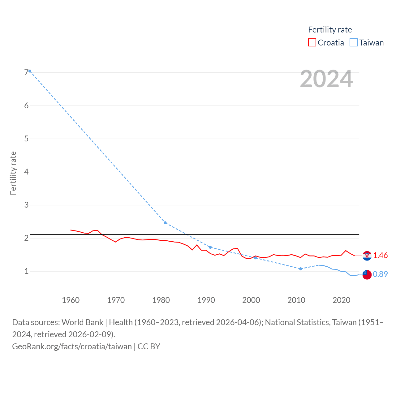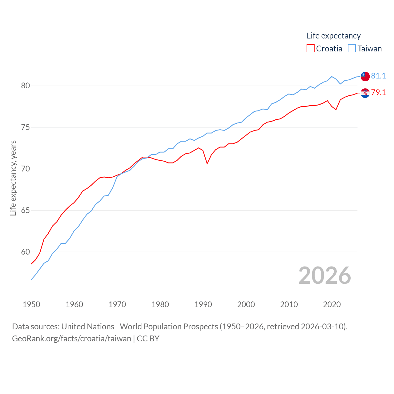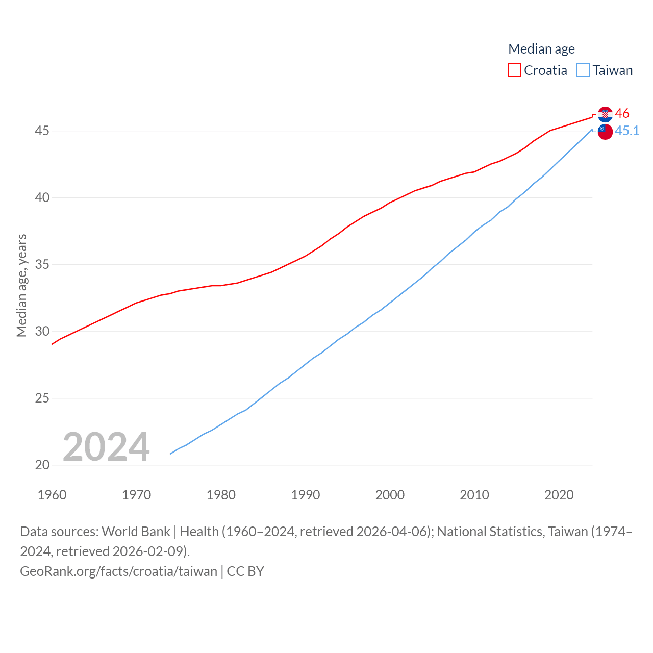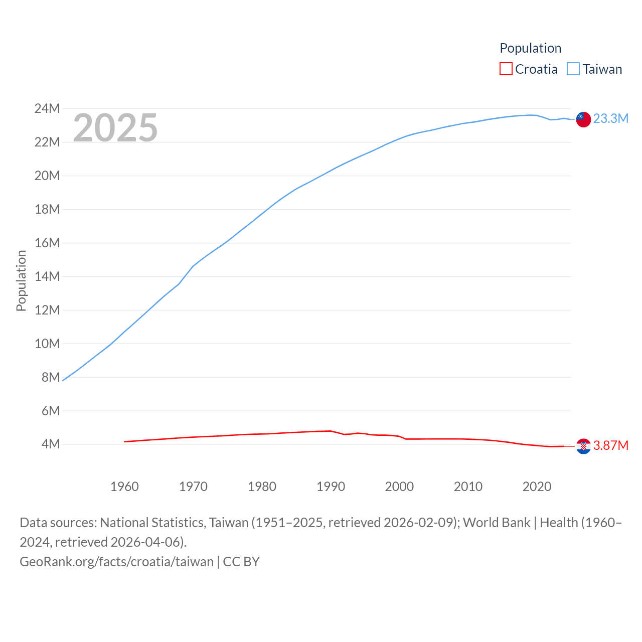 Croatia has a population of 3.87M (ranked 129/197), compared with 23.3M in Taiwan (ranked 60/197). Croatia's land area is 21,606 sq mi versus 13,976 sq mi for Taiwan (ranked 123rd vs. 133rd).