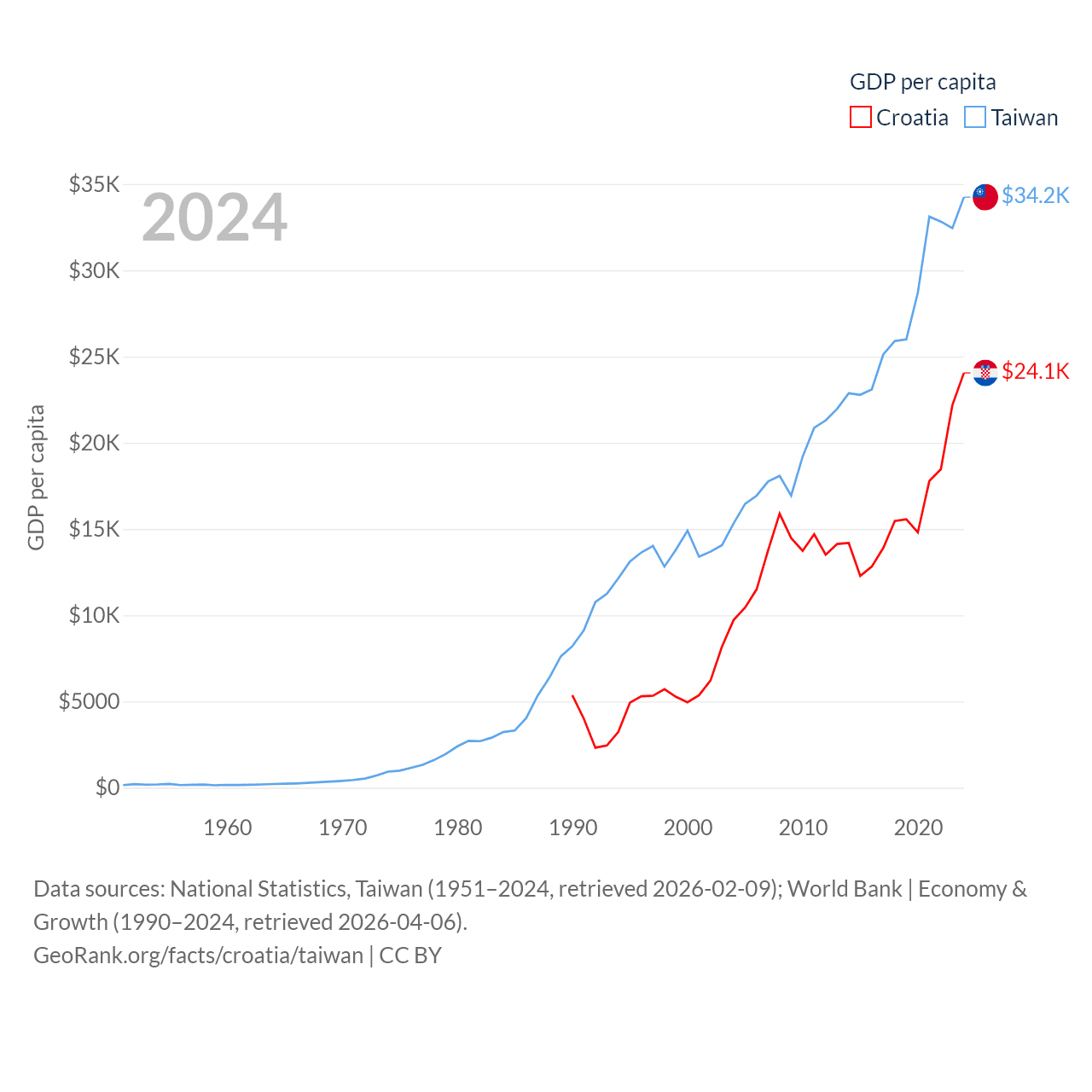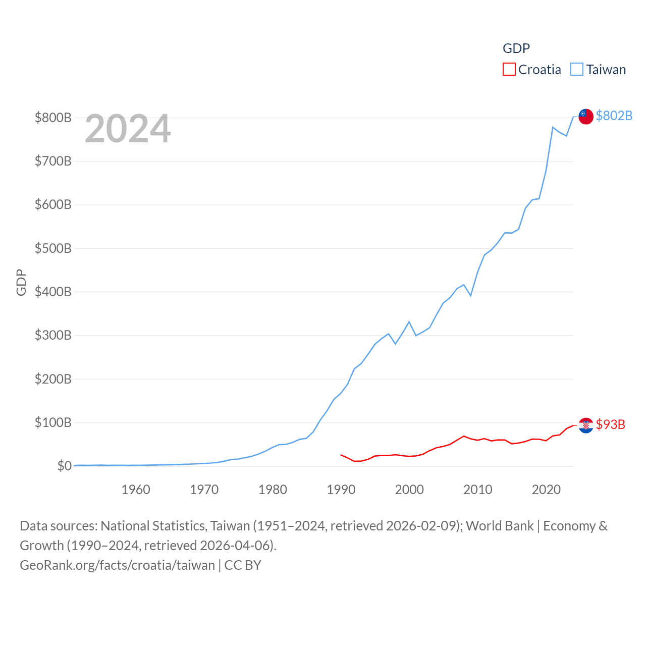 By GDP, Croatia ranks 75/197 ($93B) and Taiwan ranks 22/197 ($802B). By GDP per capita, Croatia ranks 50/197 ($24,050), while Taiwan ranks 35/197 ($34,238).