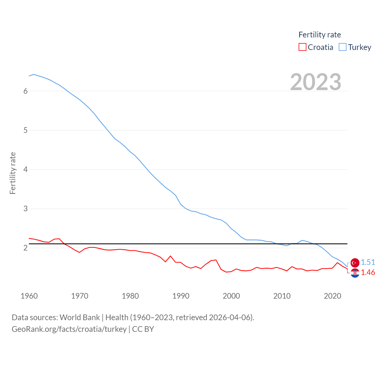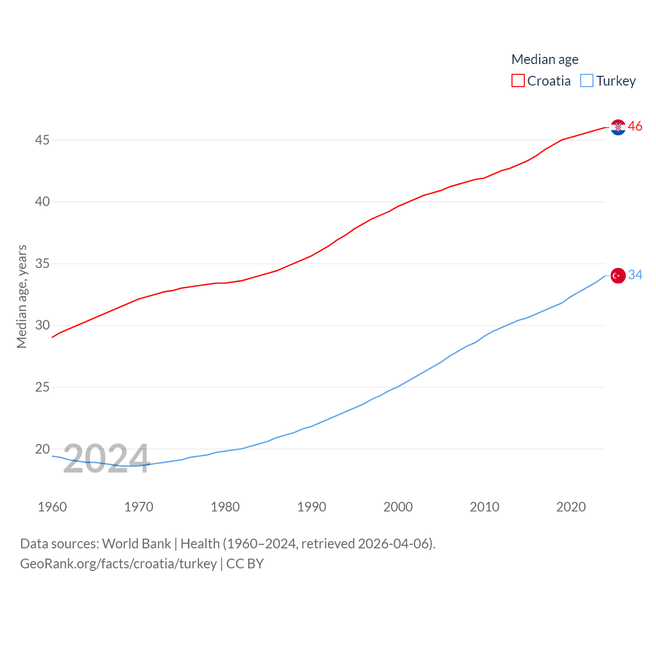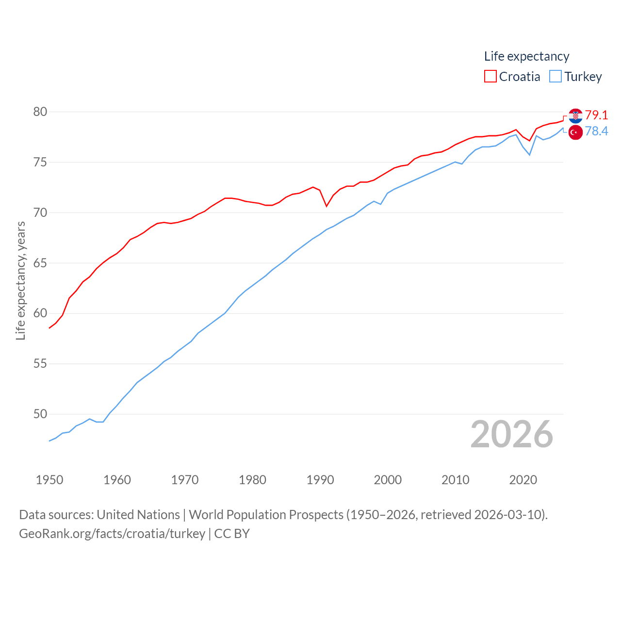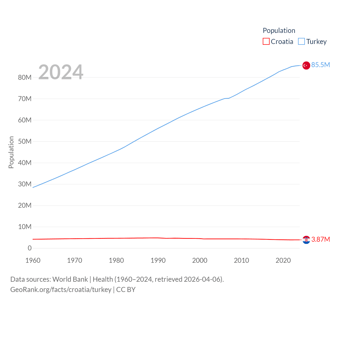 Croatia has a population of 3.87M (ranked 129/197), compared with 85.5M in Turkey (ranked 18/197). Croatia's land area is 21,606 sq mi versus 297,156 sq mi for Turkey (ranked 123rd vs. 36th).
