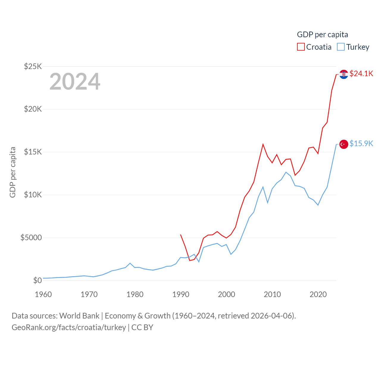 By GDP, Croatia ranks 75/197 ($93B) and Turkey ranks 17/197 ($1.36T). By GDP per capita, Croatia ranks 50/197 ($24,050), while Turkey ranks 66/197 ($15,893).