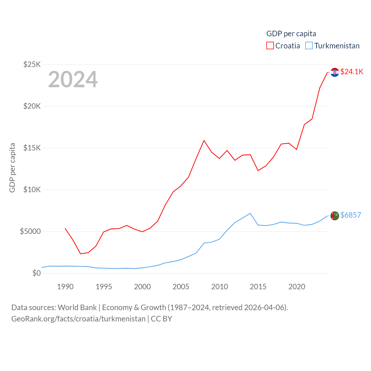 By GDP, Croatia ranks 75/197 ($93B) and Turkmenistan ranks 92/197 ($51.4B). By GDP per capita, Croatia ranks 50/197 ($24,050), while Turkmenistan ranks 104/197 ($6,857).