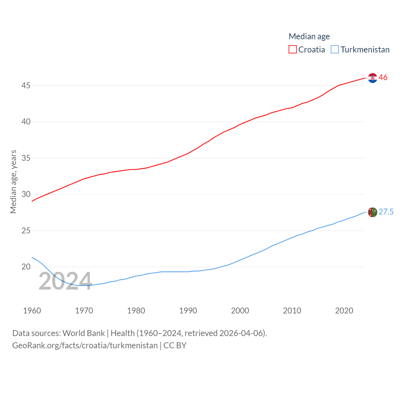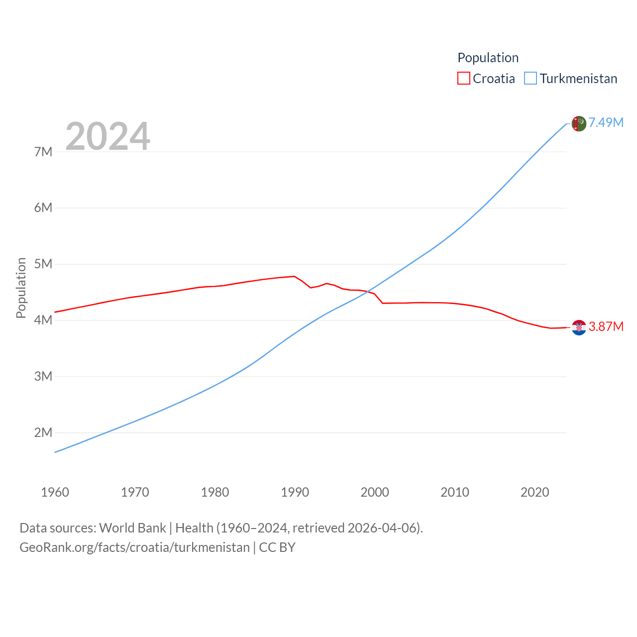 Croatia has a population of 3.87M (ranked 129/197), compared with 7.49M in Turkmenistan (ranked 104/197). Croatia's land area is 21,606 sq mi versus 181,441 sq mi for Turkmenistan (ranked 123rd vs. 53rd).