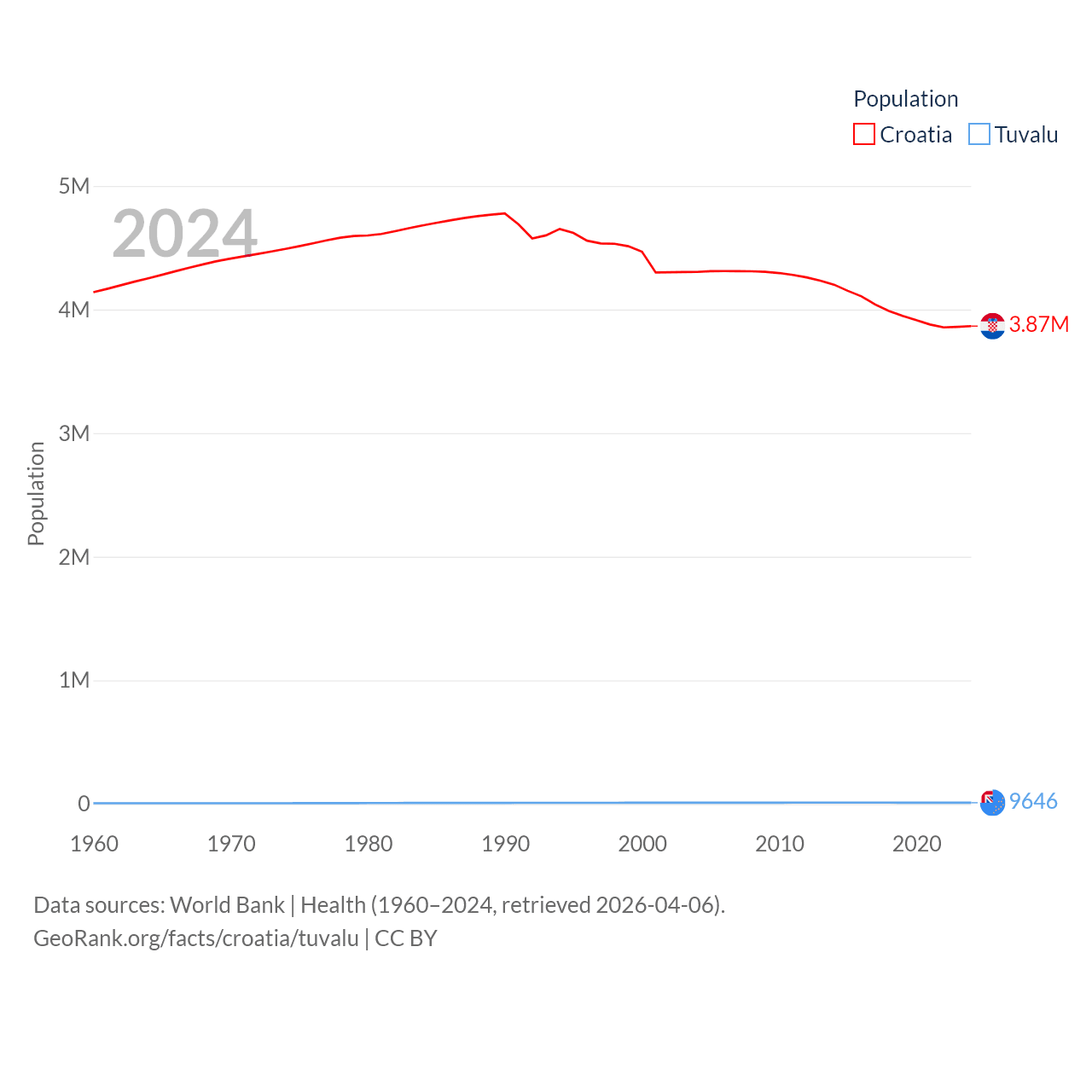Croatia has a population of 3.87M (ranked 129/197), compared with 9.65K in Tuvalu (ranked 196/197). Croatia's land area is 21,606 sq mi versus 11.6 sq mi for Tuvalu (ranked 123rd vs. 194th).