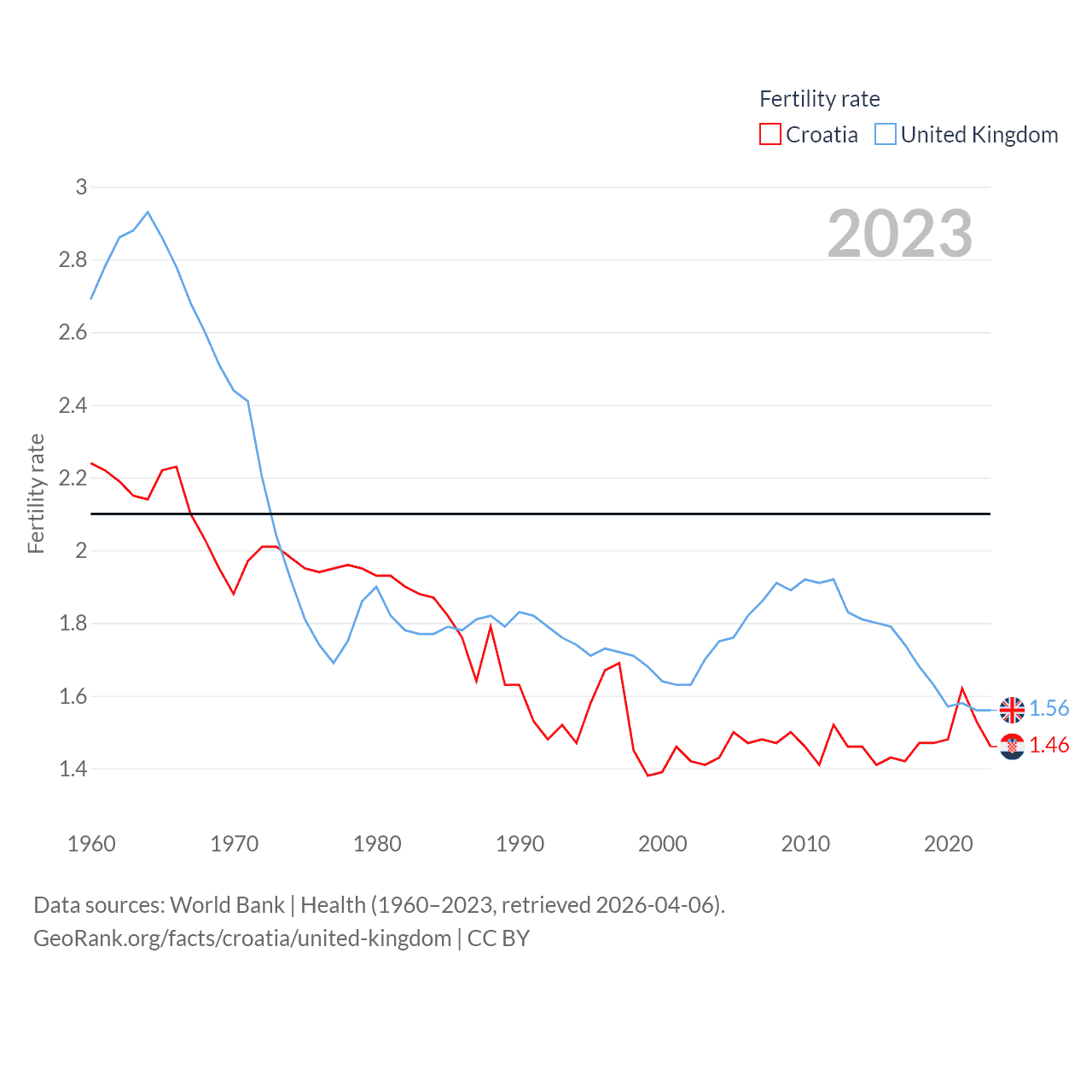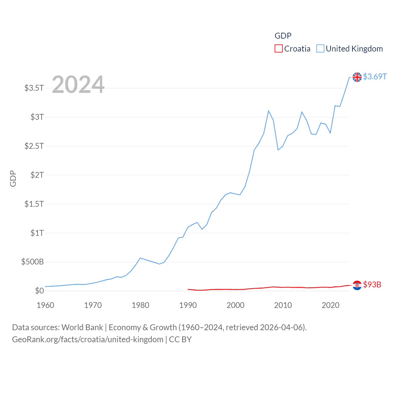 By GDP, Croatia ranks 75/197 ($93B) and The United Kingdom ranks 6/197 ($3.69T). By GDP per capita, Croatia ranks 50/197 ($24,050), while The United Kingdom ranks 22/197 ($53,246).