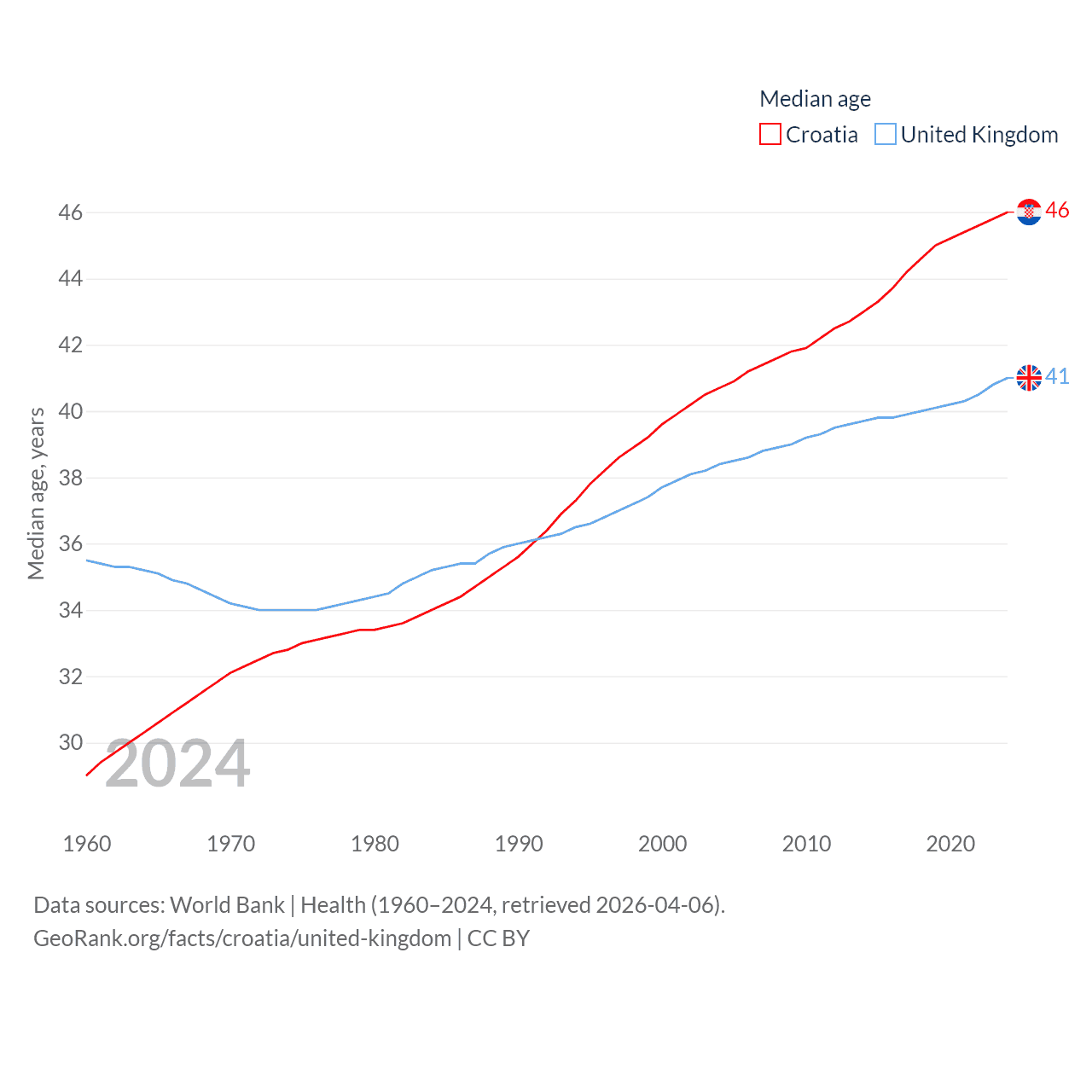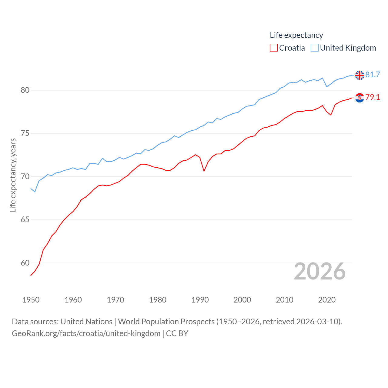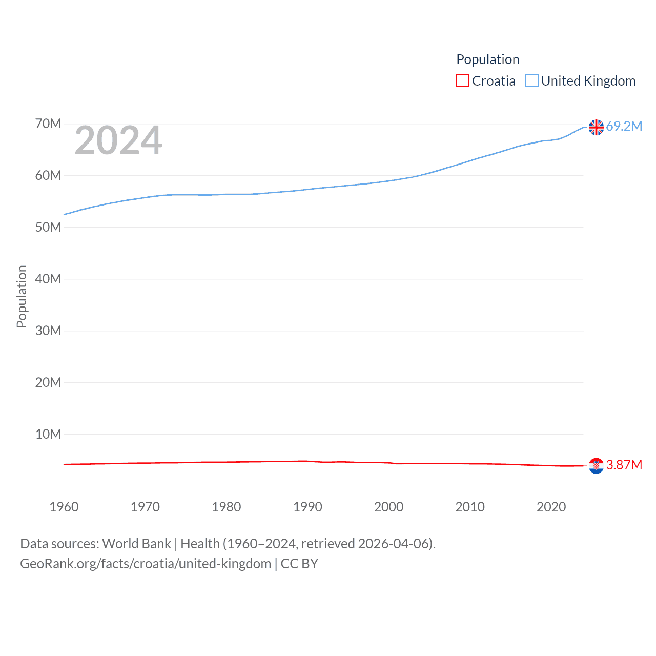 Croatia has a population of 3.87M (ranked 129/197), compared with 69.2M in The United Kingdom (ranked 21/197). Croatia's land area is 21,606 sq mi versus 93,410 sq mi for The United Kingdom (ranked 123rd vs. 78th).