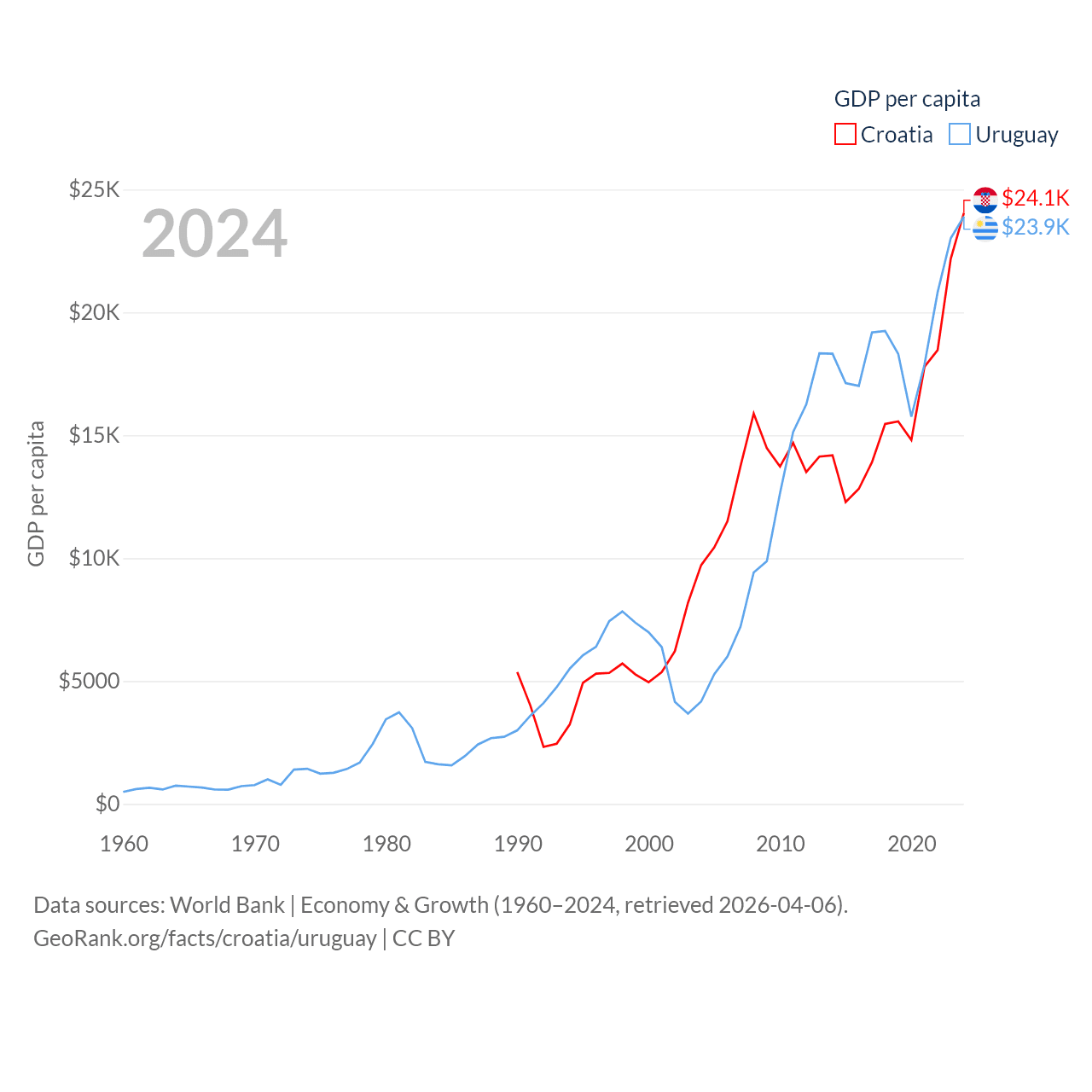 By GDP, Croatia ranks 75/197 ($93B) and Uruguay ranks 81/197 ($81B). By GDP per capita, Croatia ranks 50/197 ($24,050), while Uruguay ranks 52/197 ($23,907).