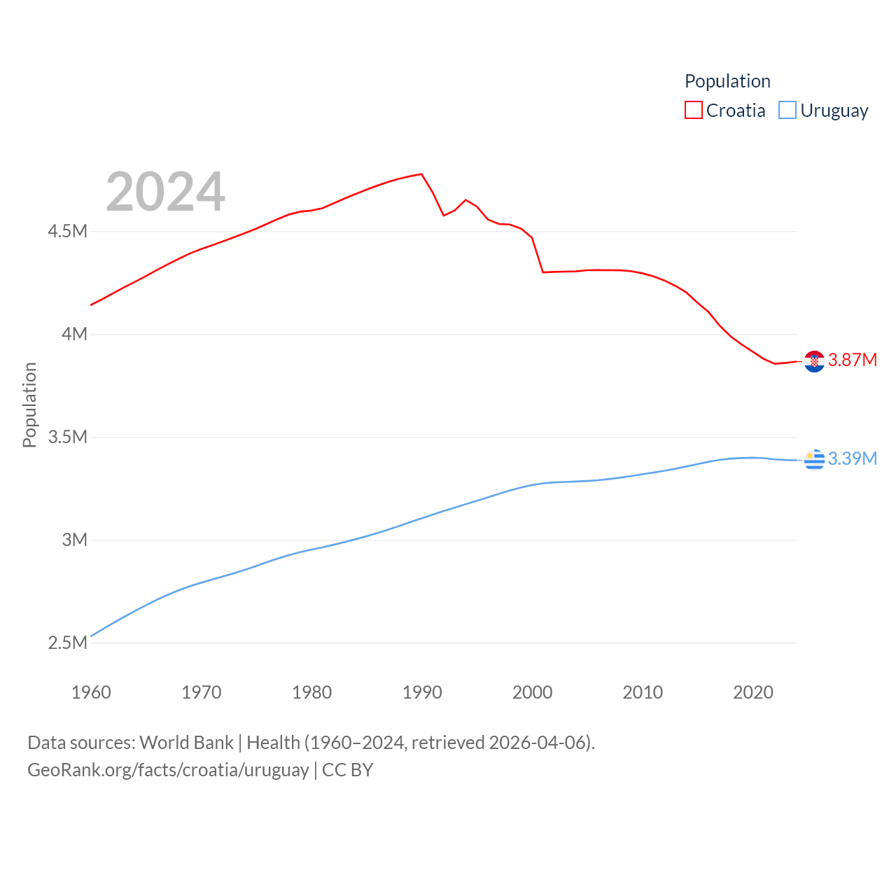 Croatia has a population of 3.87M (ranked 129/197), compared with 3.39M in Uruguay (ranked 133/197). Croatia's land area is 21,606 sq mi versus 67,576 sq mi for Uruguay (ranked 123rd vs. 89th).