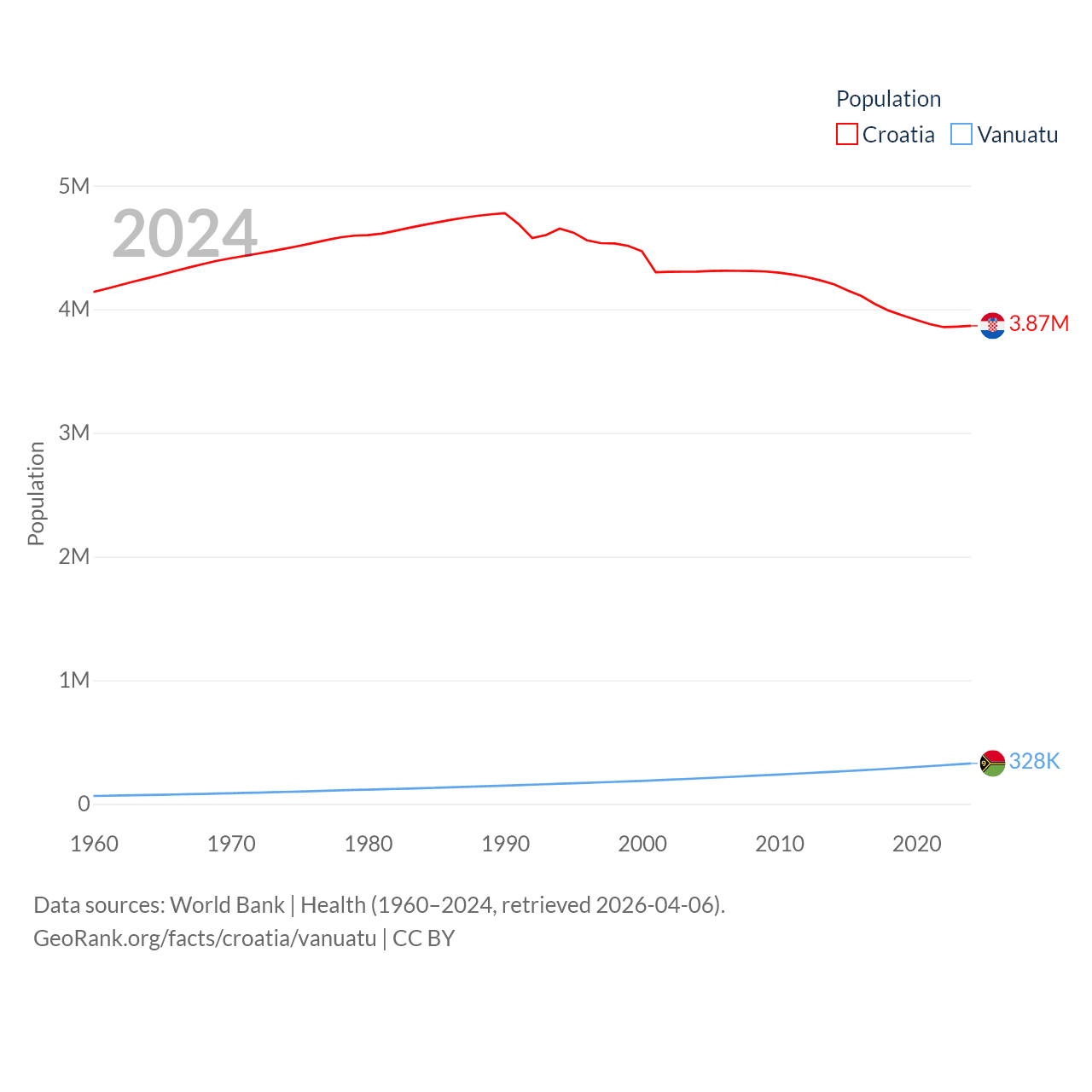Croatia has a population of 3.87M (ranked 129/197), compared with 328K in Vanuatu (ranked 174/197). Croatia's land area is 21,606 sq mi versus 4,707 sq mi for Vanuatu (ranked 123rd vs. 157th).