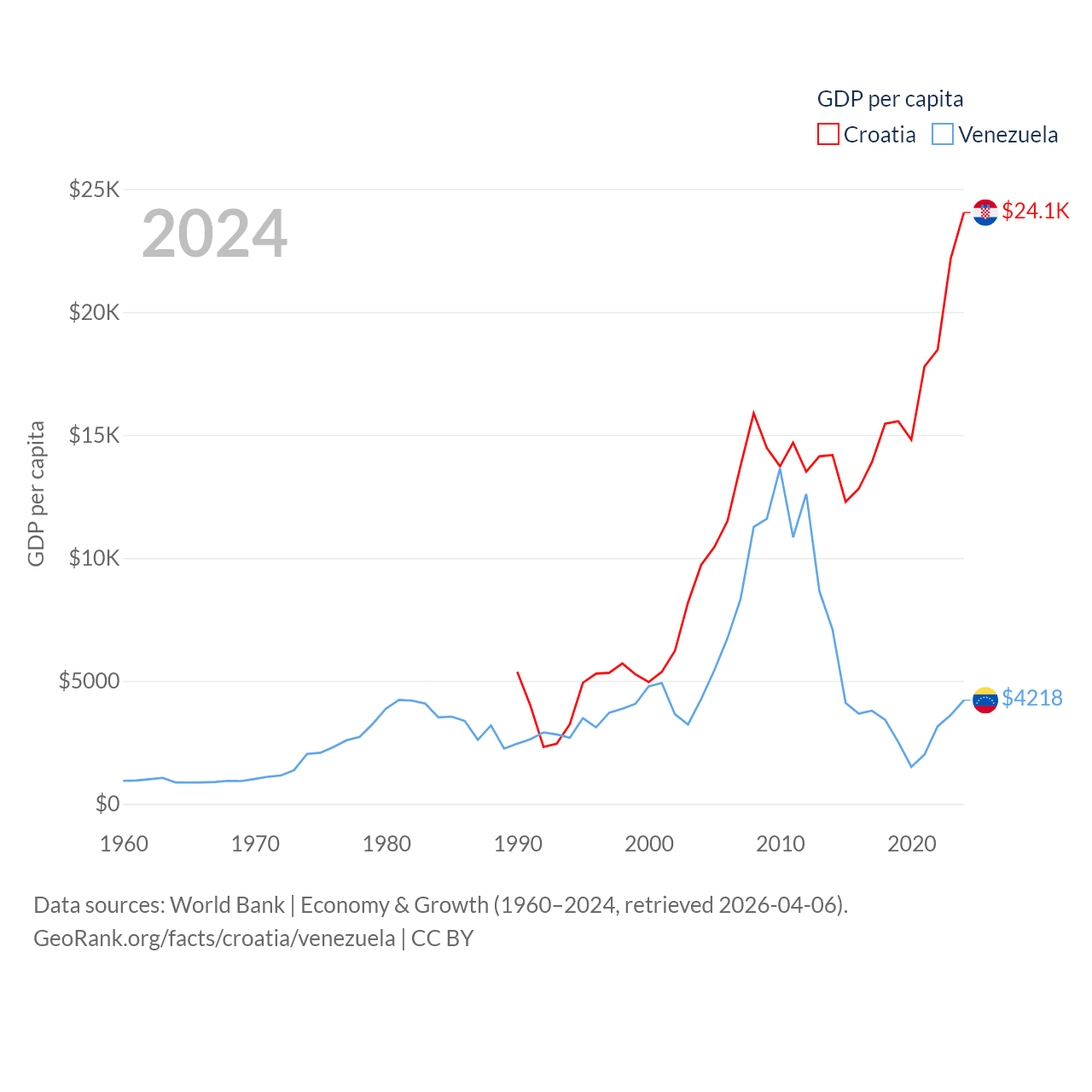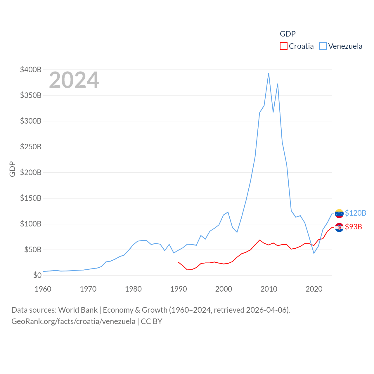 By GDP, Croatia ranks 75/197 ($93B) and Venezuela ranks 65/197 ($120B). By GDP per capita, Croatia ranks 50/197 ($24,050), while Venezuela ranks 128/197 ($4,218).