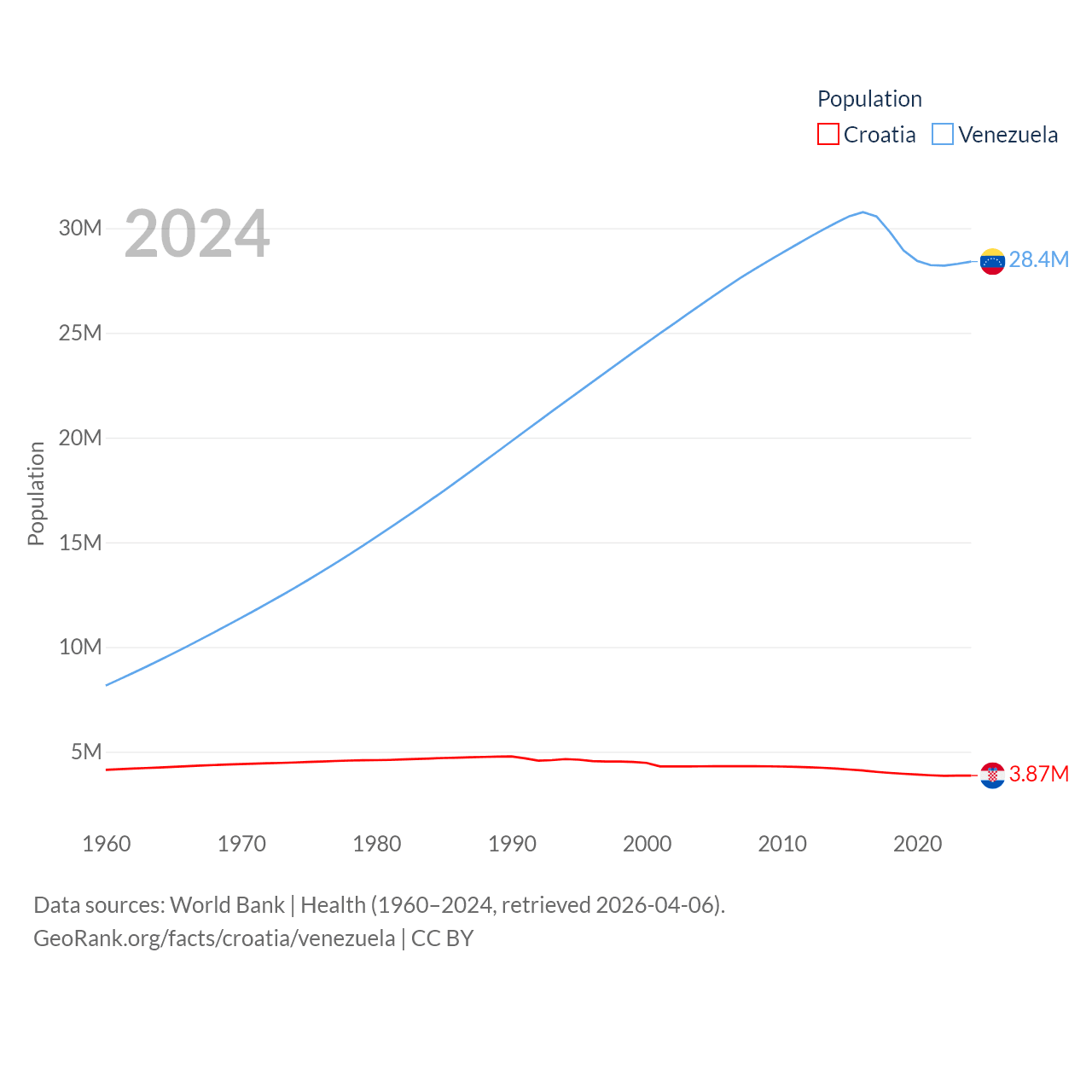 Croatia has a population of 3.87M (ranked 129/197), compared with 28.4M in Venezuela (ranked 53/197). Croatia's land area is 21,606 sq mi versus 340,561 sq mi for Venezuela (ranked 123rd vs. 32nd).