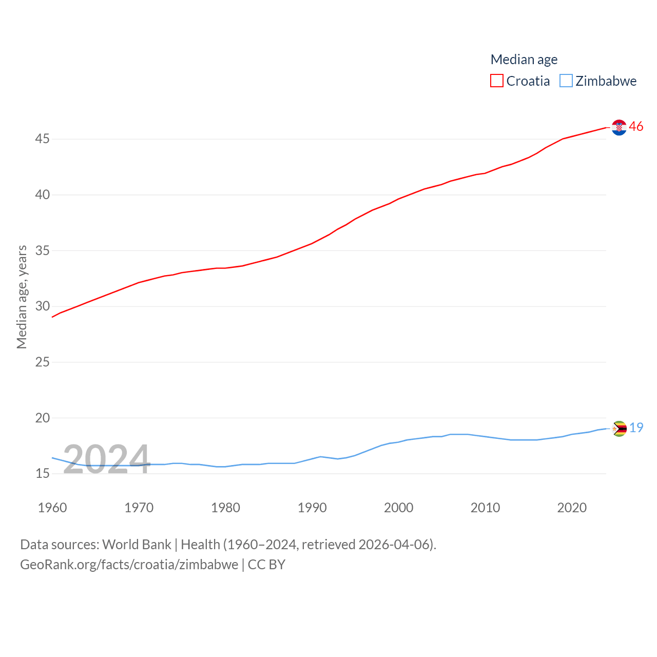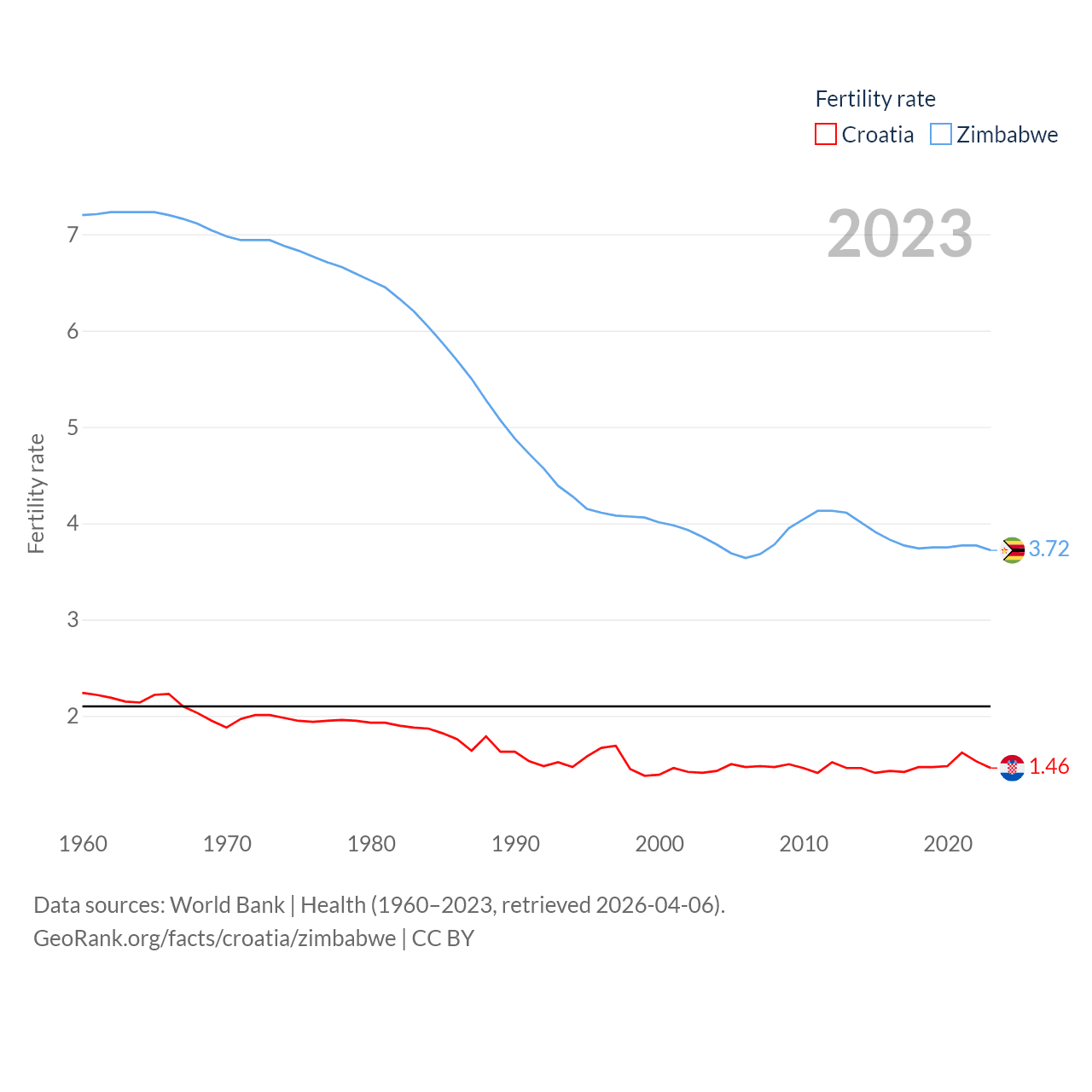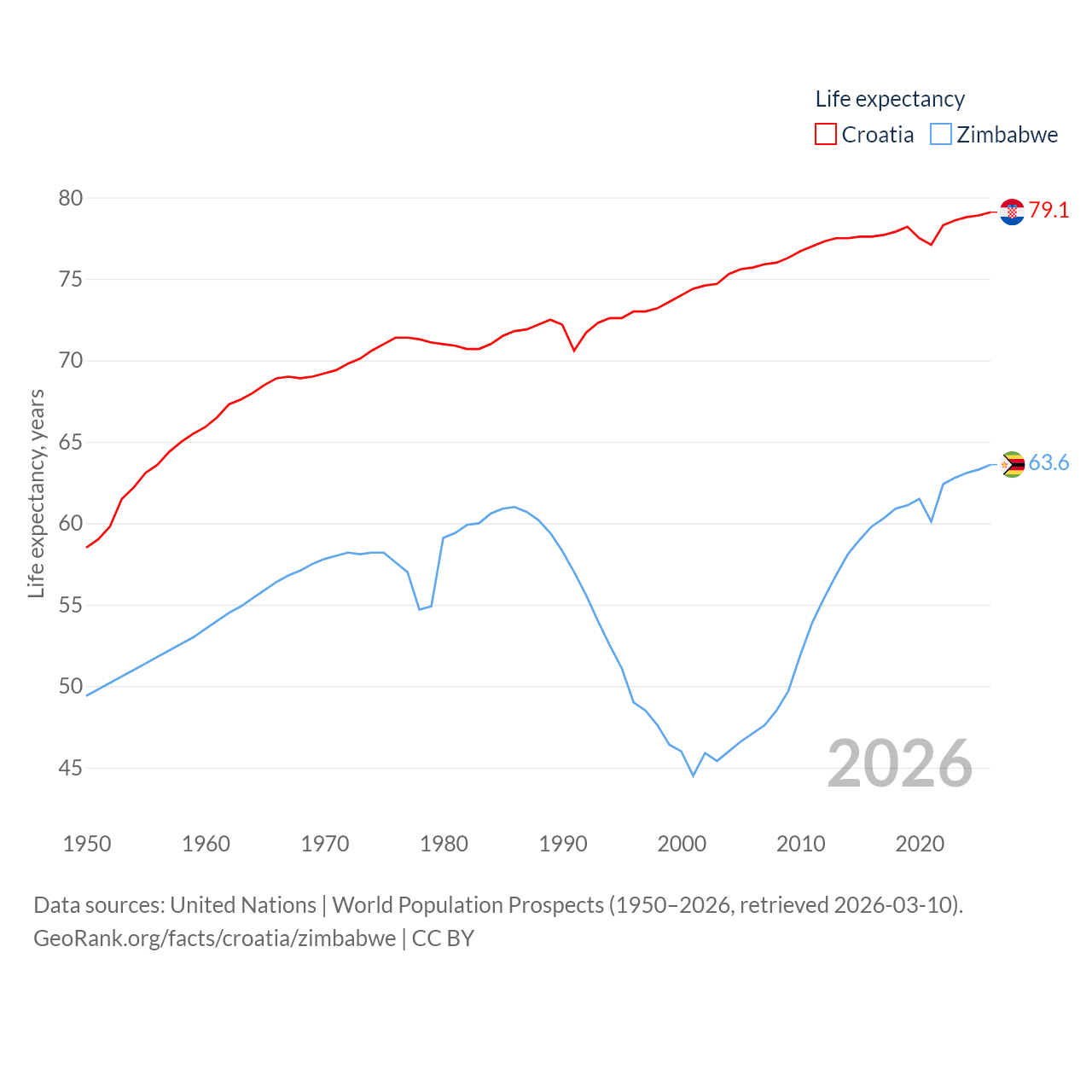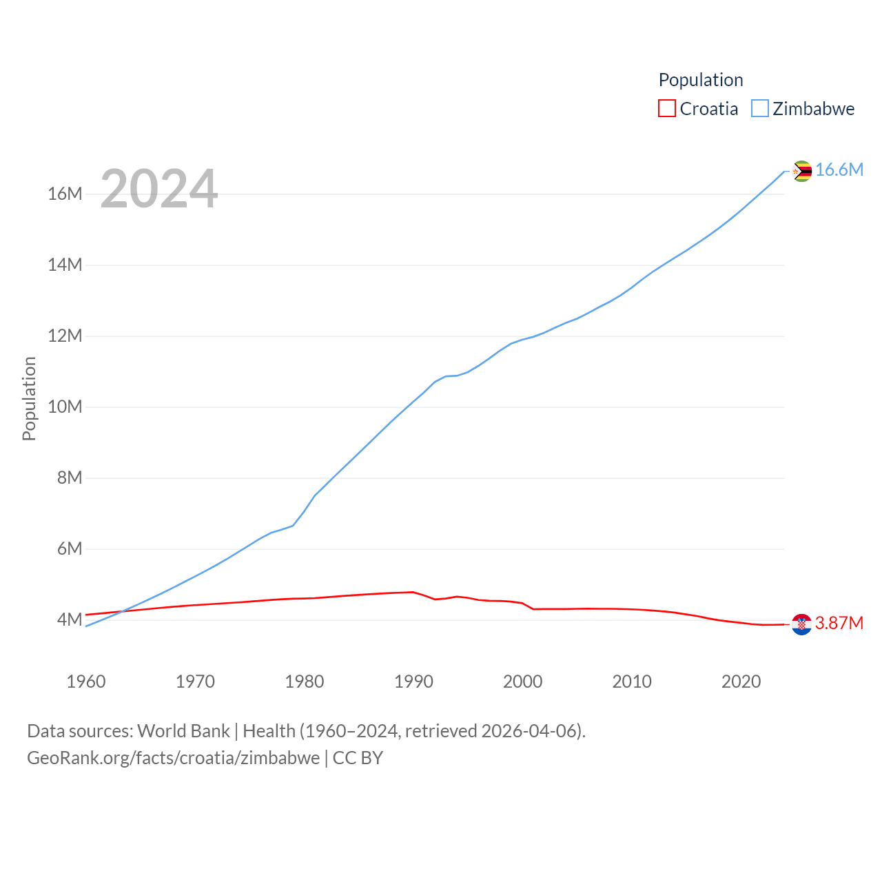 Croatia has a population of 3.87M (ranked 129/197), compared with 16.6M in Zimbabwe (ranked 74/197). Croatia's land area is 21,606 sq mi versus 149,364 sq mi for Zimbabwe (ranked 123rd vs. 60th).