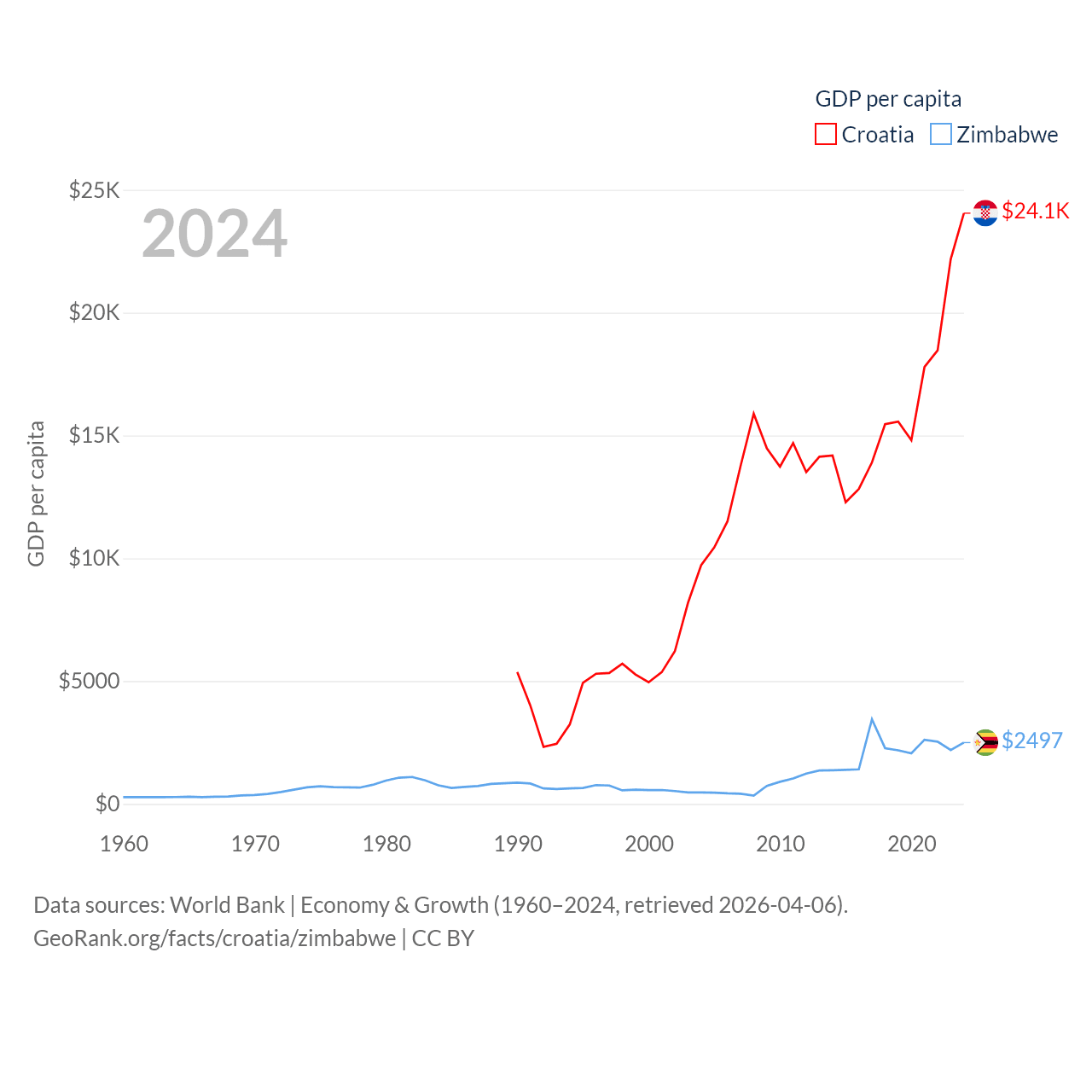 By GDP, Croatia ranks 75/197 ($93B) and Zimbabwe ranks 102/197 ($41.5B). By GDP per capita, Croatia ranks 50/197 ($24,050), while Zimbabwe ranks 148/197 ($2,497).
