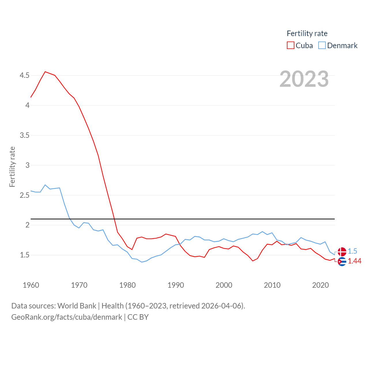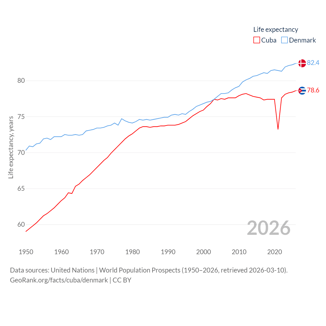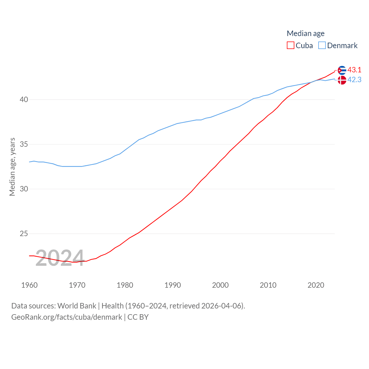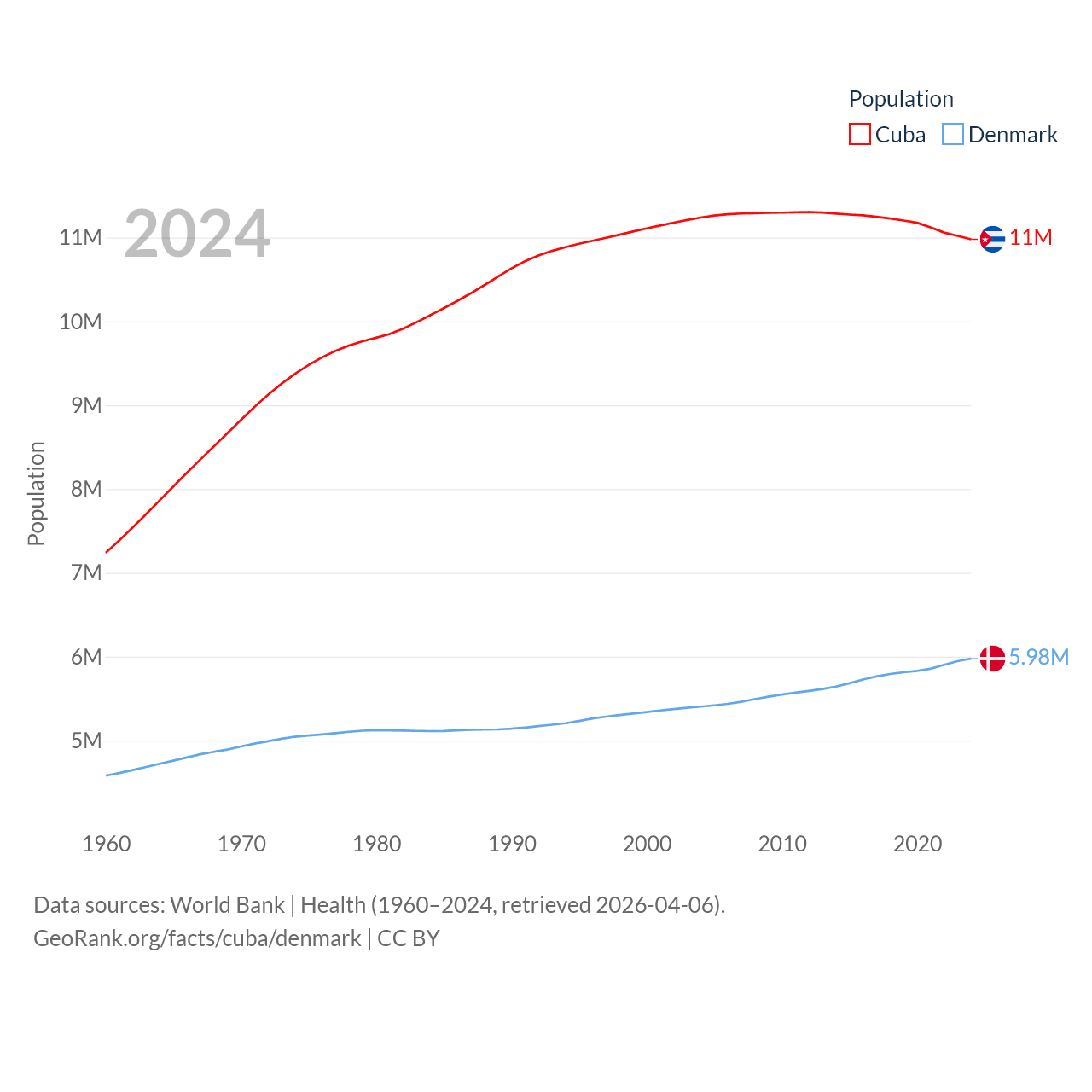 Cuba has a population of 11M (ranked 87/197), compared with 5.98M in Denmark (ranked 114/197). Cuba's land area is 40,077 sq mi versus 15,444 sq mi for Denmark (ranked 103rd vs. 130th).