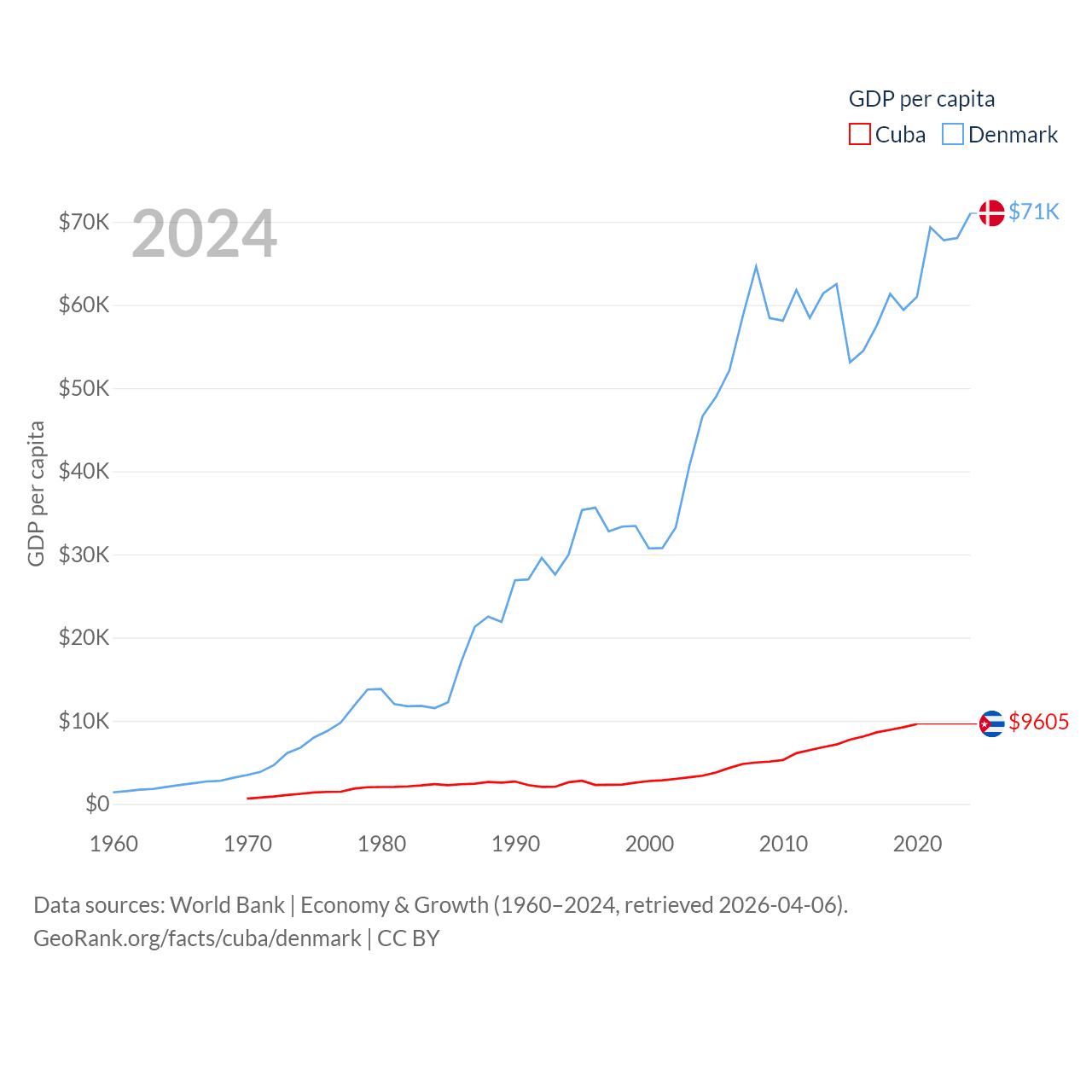 By GDP, Cuba ranks 69/197 ($107B) and Denmark ranks 37/197 ($425B). By GDP per capita, Cuba ranks 86/197 ($9,605), while Denmark ranks 12/197 ($71,026).