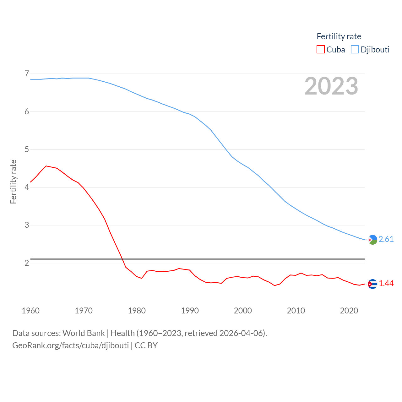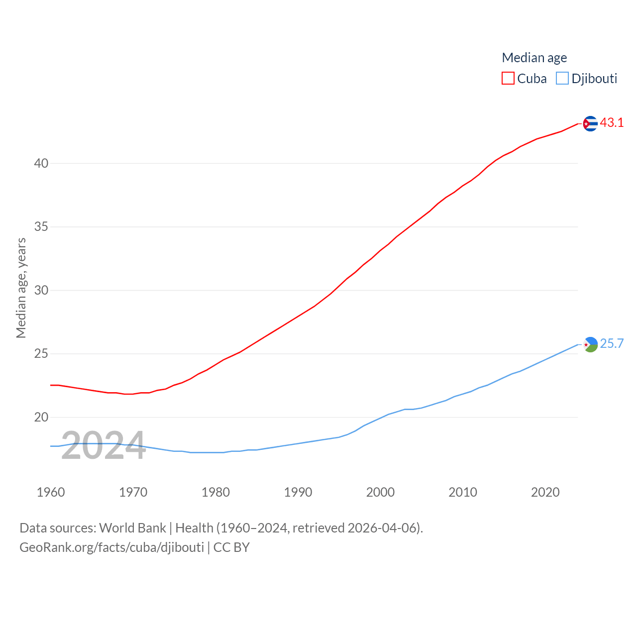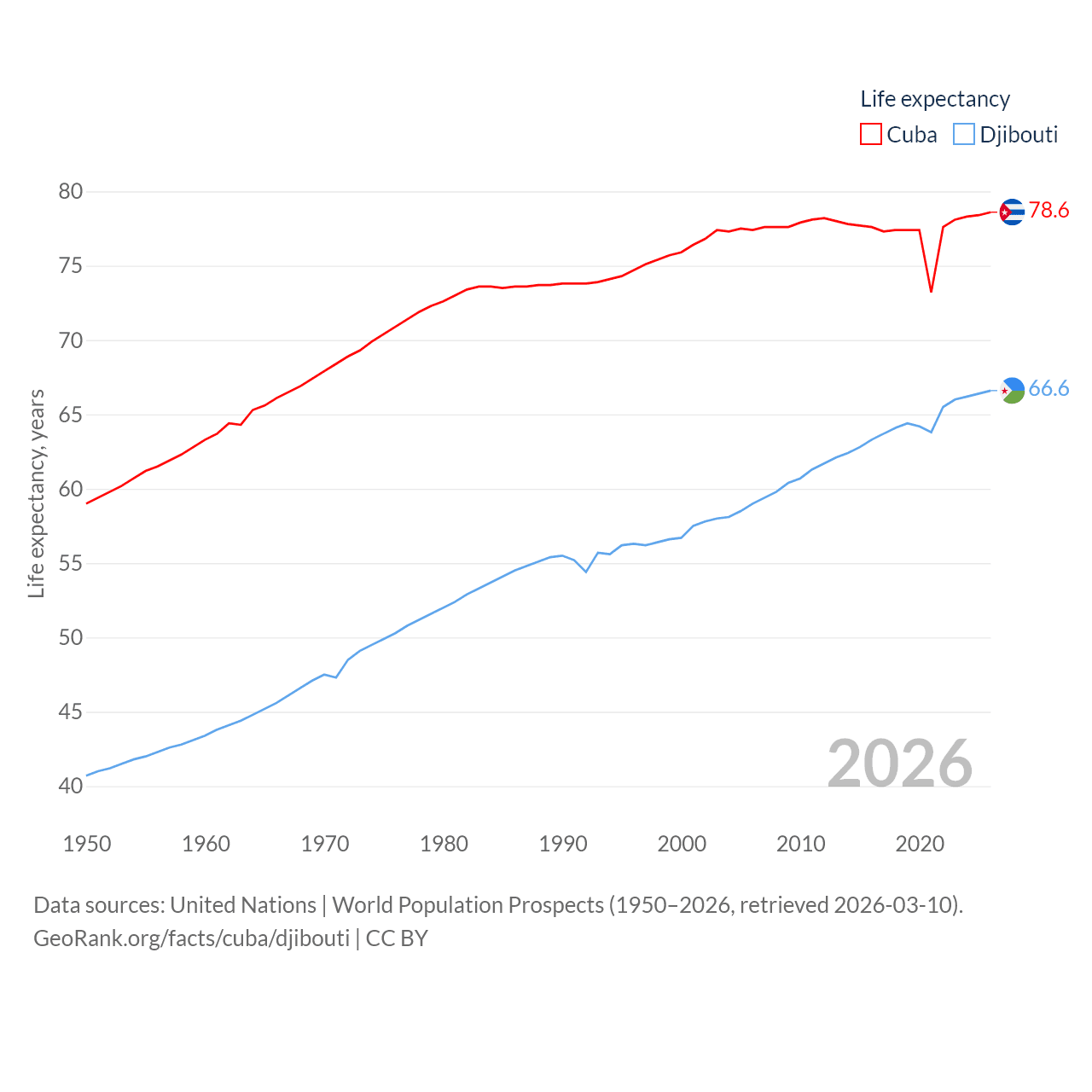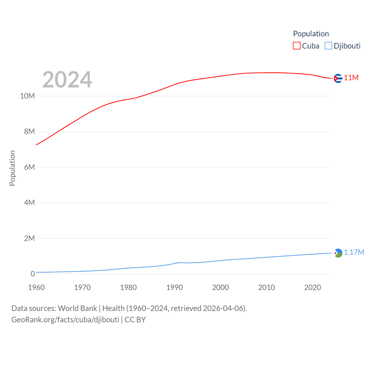 Cuba has a population of 11M (ranked 87/197), compared with 1.17M in Djibouti (ranked 158/197). Cuba's land area is 40,077 sq mi versus 8,950 sq mi for Djibouti (ranked 103rd vs. 147th).