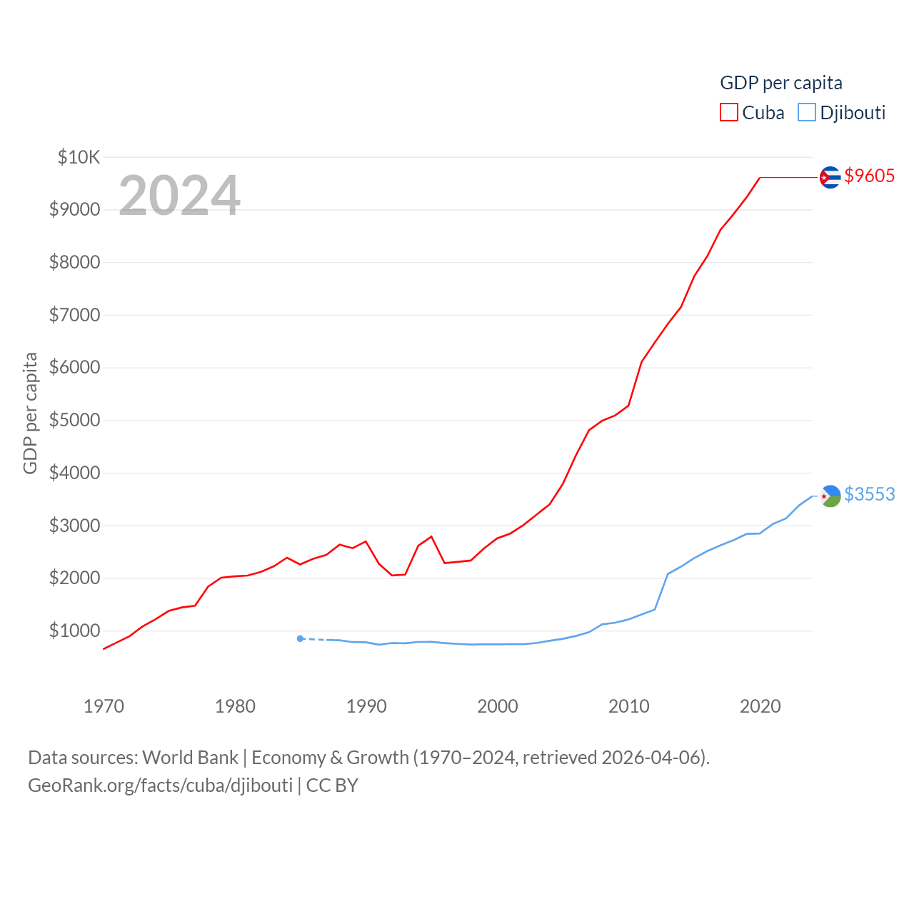 By GDP, Cuba ranks 69/197 ($107B) and Djibouti ranks 165/197 ($4.15B). By GDP per capita, Cuba ranks 86/197 ($9,605), while Djibouti ranks 133/197 ($3,553).