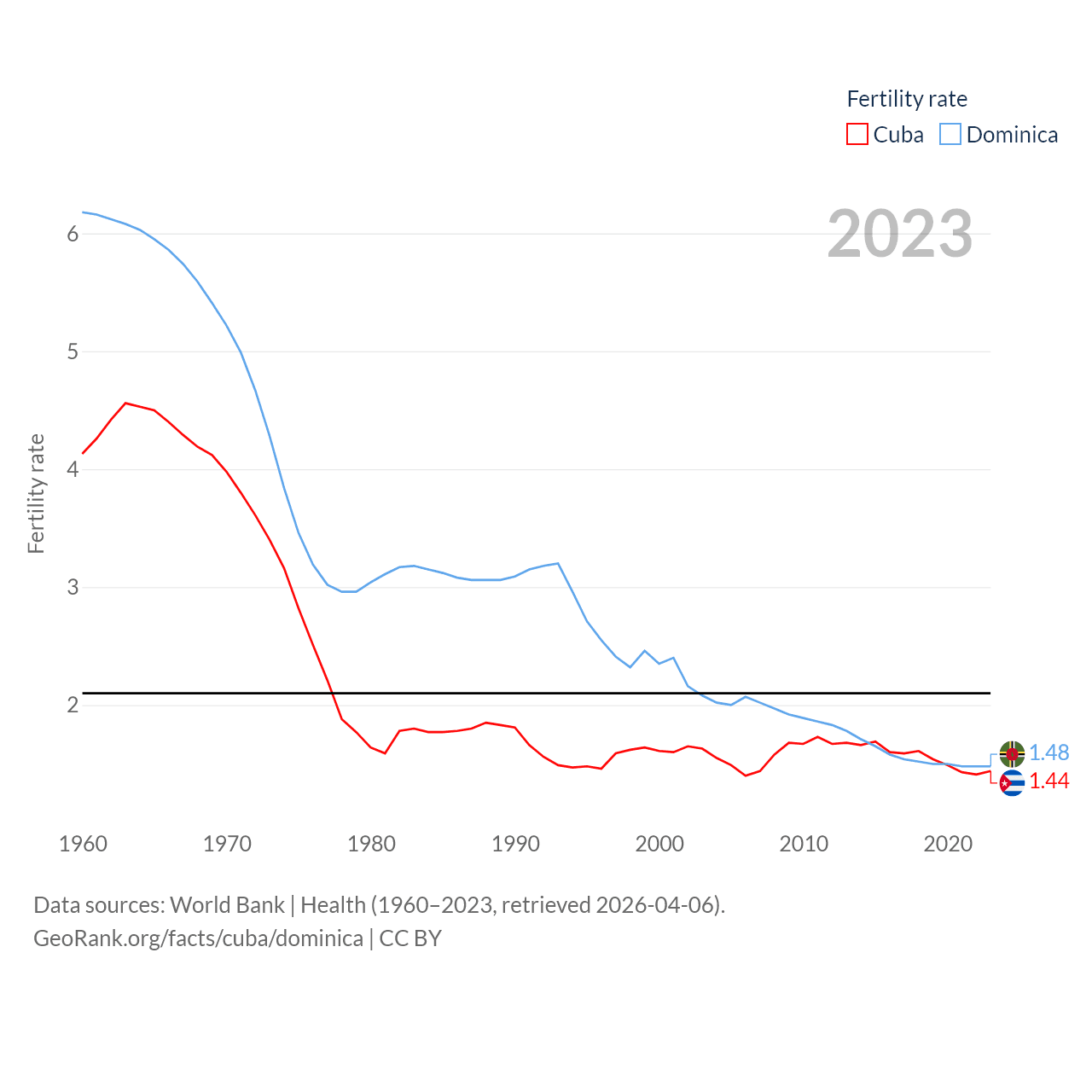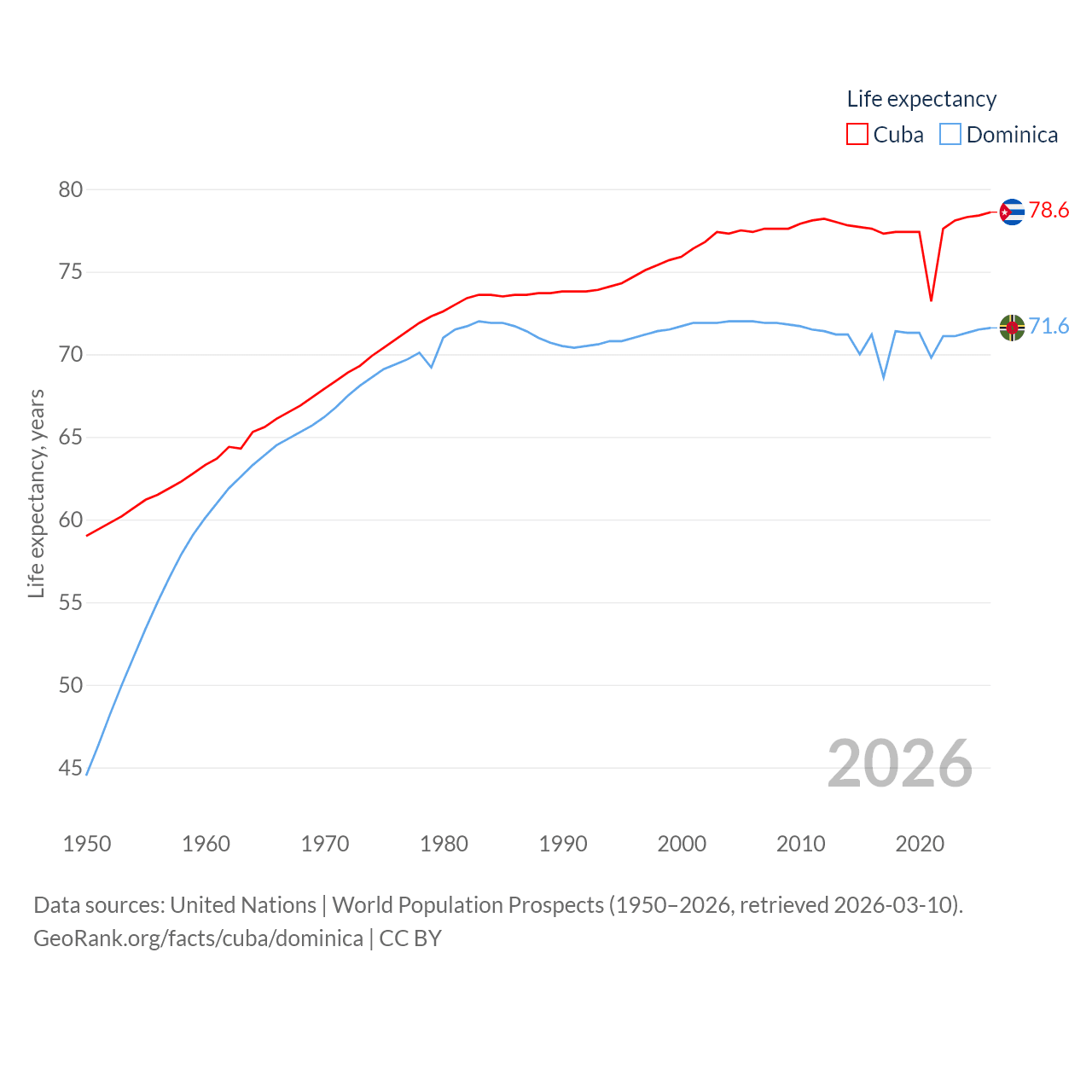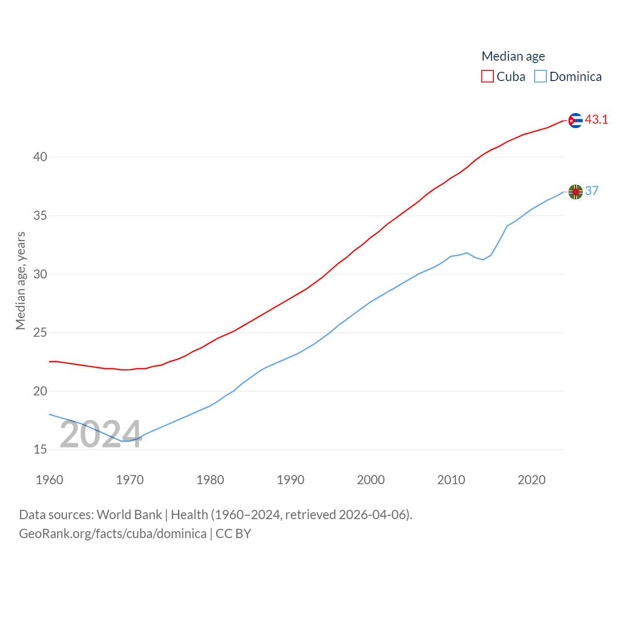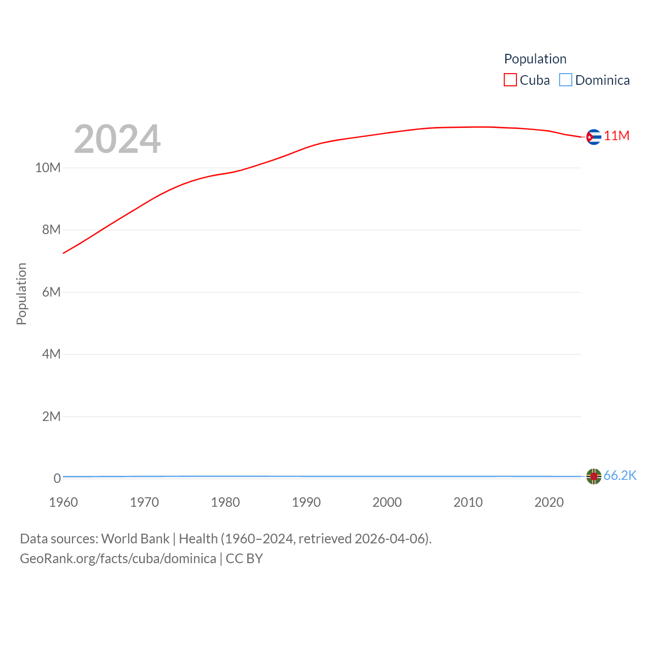 Cuba has a population of 11M (ranked 87/197), compared with 66.2K in Dominica (ranked 188/197). Cuba's land area is 40,077 sq mi versus 289.6 sq mi for Dominica (ranked 103rd vs. 175th).