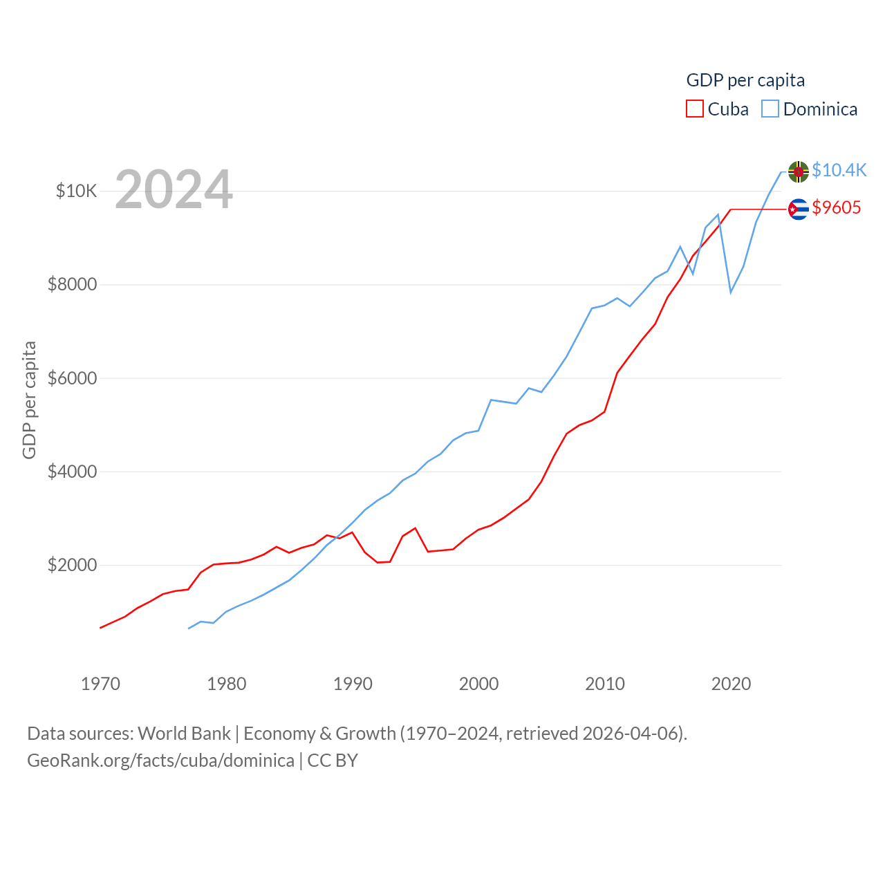By GDP, Cuba ranks 69/197 ($107B) and Dominica ranks 190/197 ($689M). By GDP per capita, Cuba ranks 86/197 ($9,605), while Dominica ranks 84/197 ($10,405).