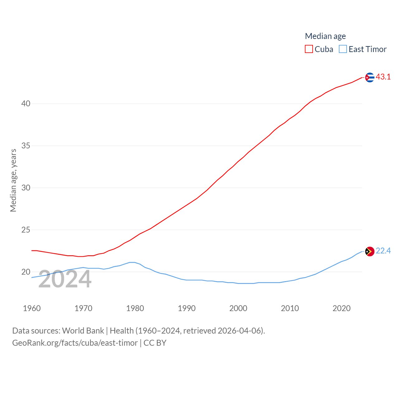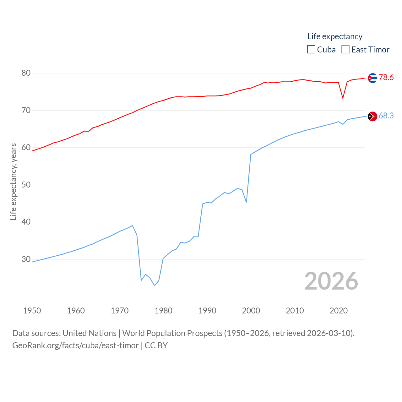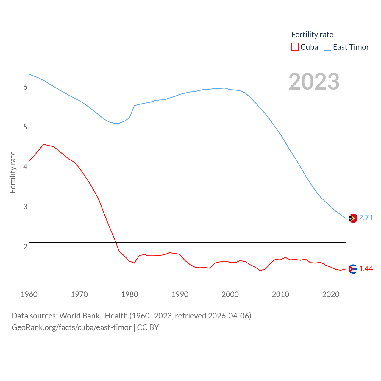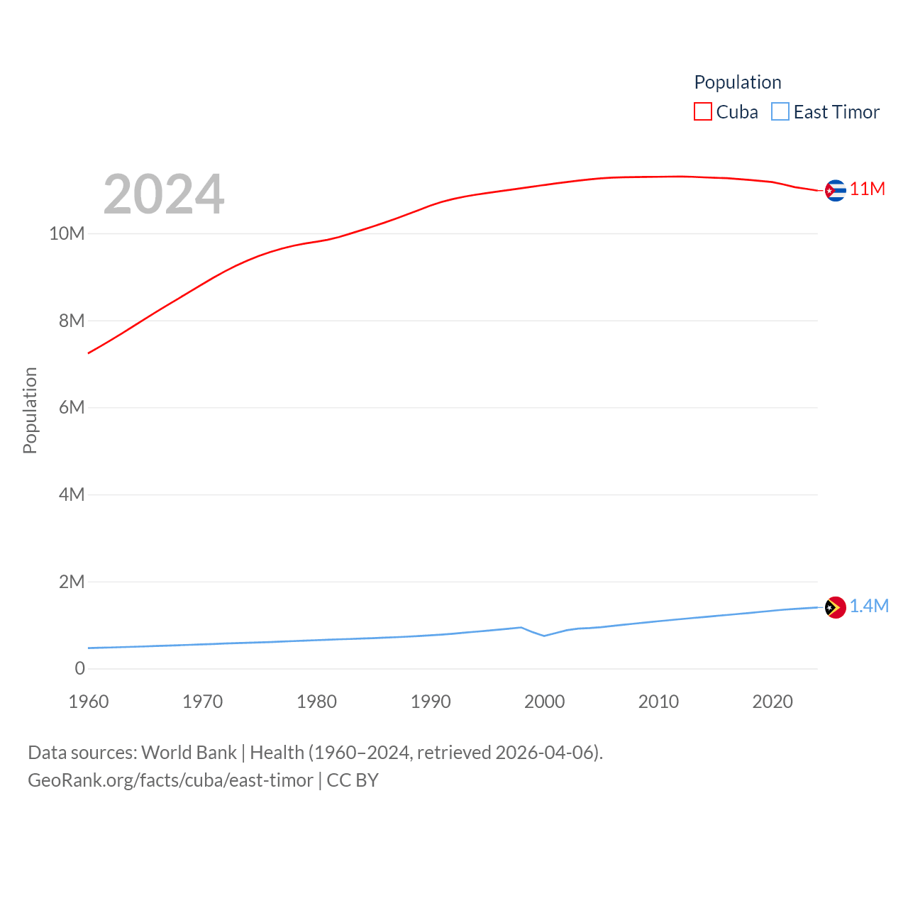 Cuba has a population of 11M (ranked 87/197), compared with 1.4M in East Timor (ranked 152/197). Cuba's land area is 40,077 sq mi versus 5,741 sq mi for East Timor (ranked 103rd vs. 155th).