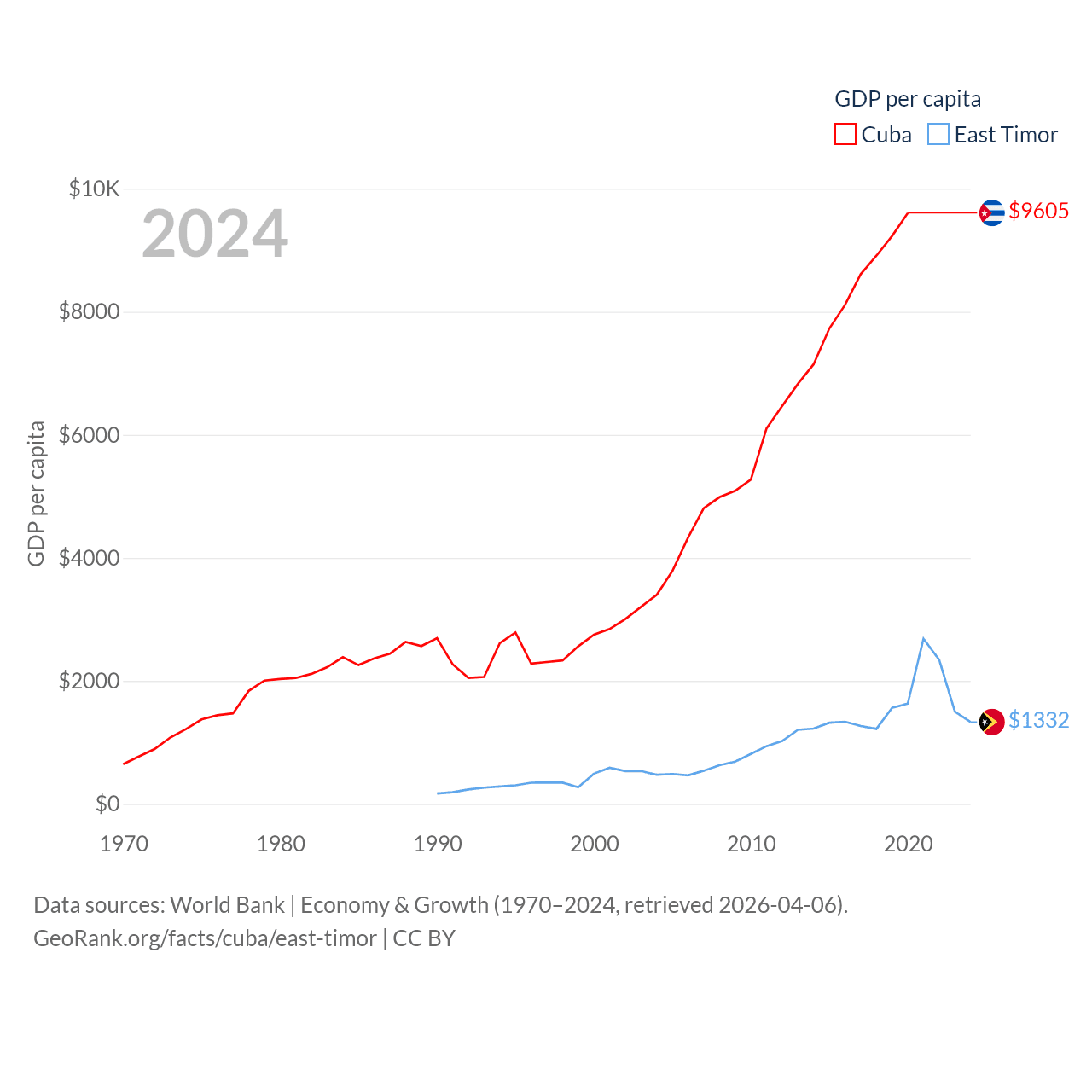 By GDP, Cuba ranks 69/197 ($107B) and East Timor ranks 181/197 ($1.87B). By GDP per capita, Cuba ranks 86/197 ($9,605), while East Timor ranks 167/197 ($1,332).