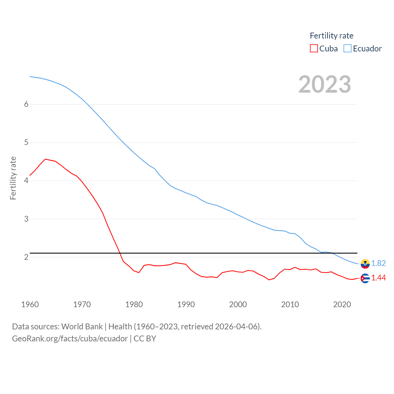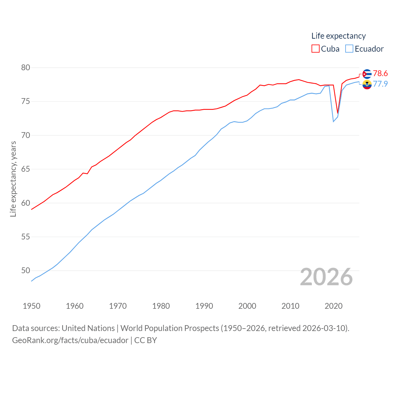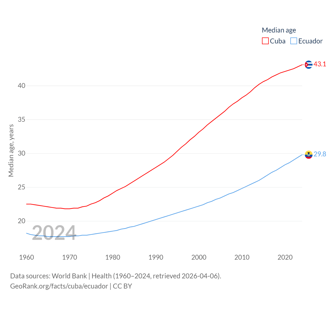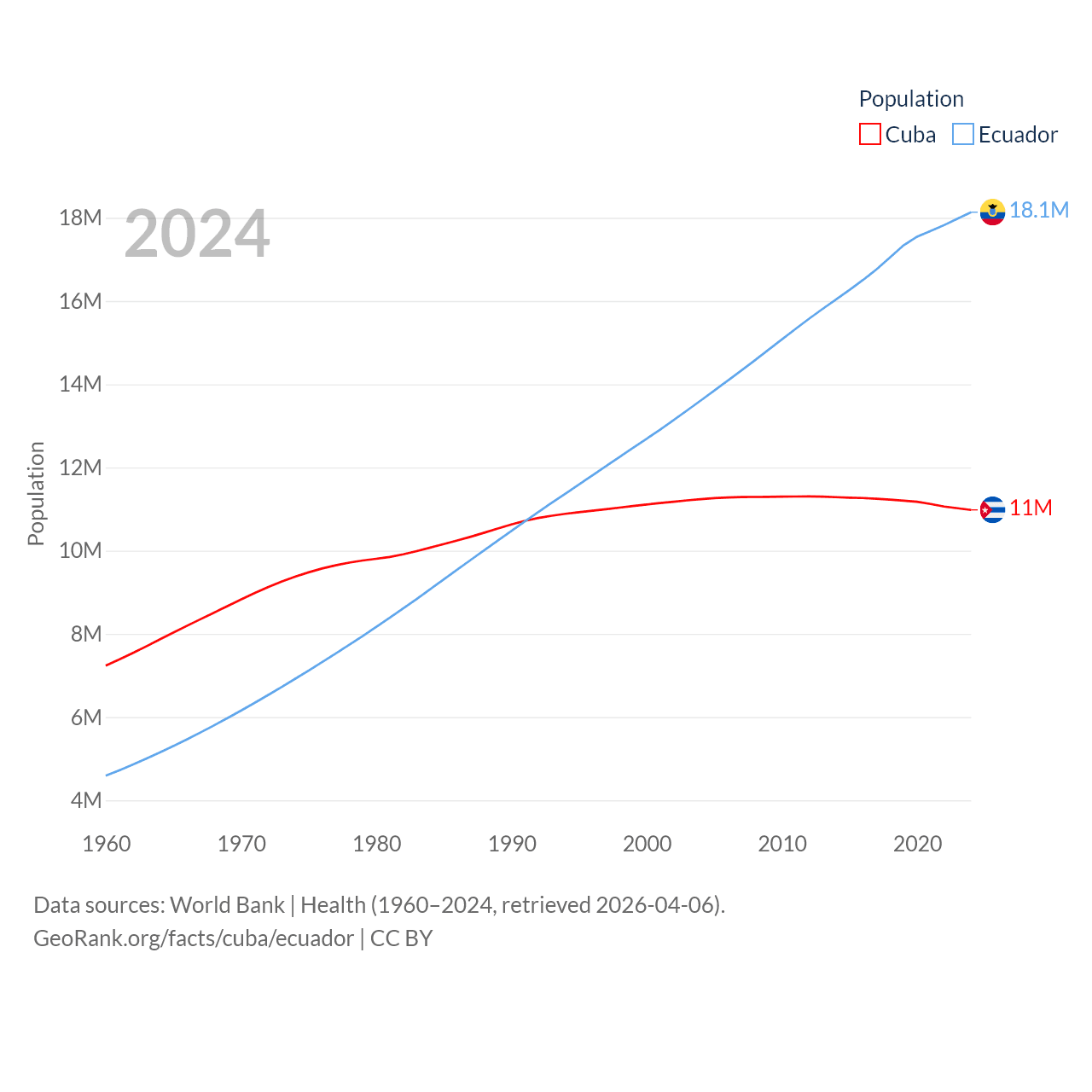 Cuba has a population of 11M (ranked 87/197), compared with 18.1M in Ecuador (ranked 71/197). Cuba's land area is 40,077 sq mi versus 95,892 sq mi for Ecuador (ranked 103rd vs. 76th).