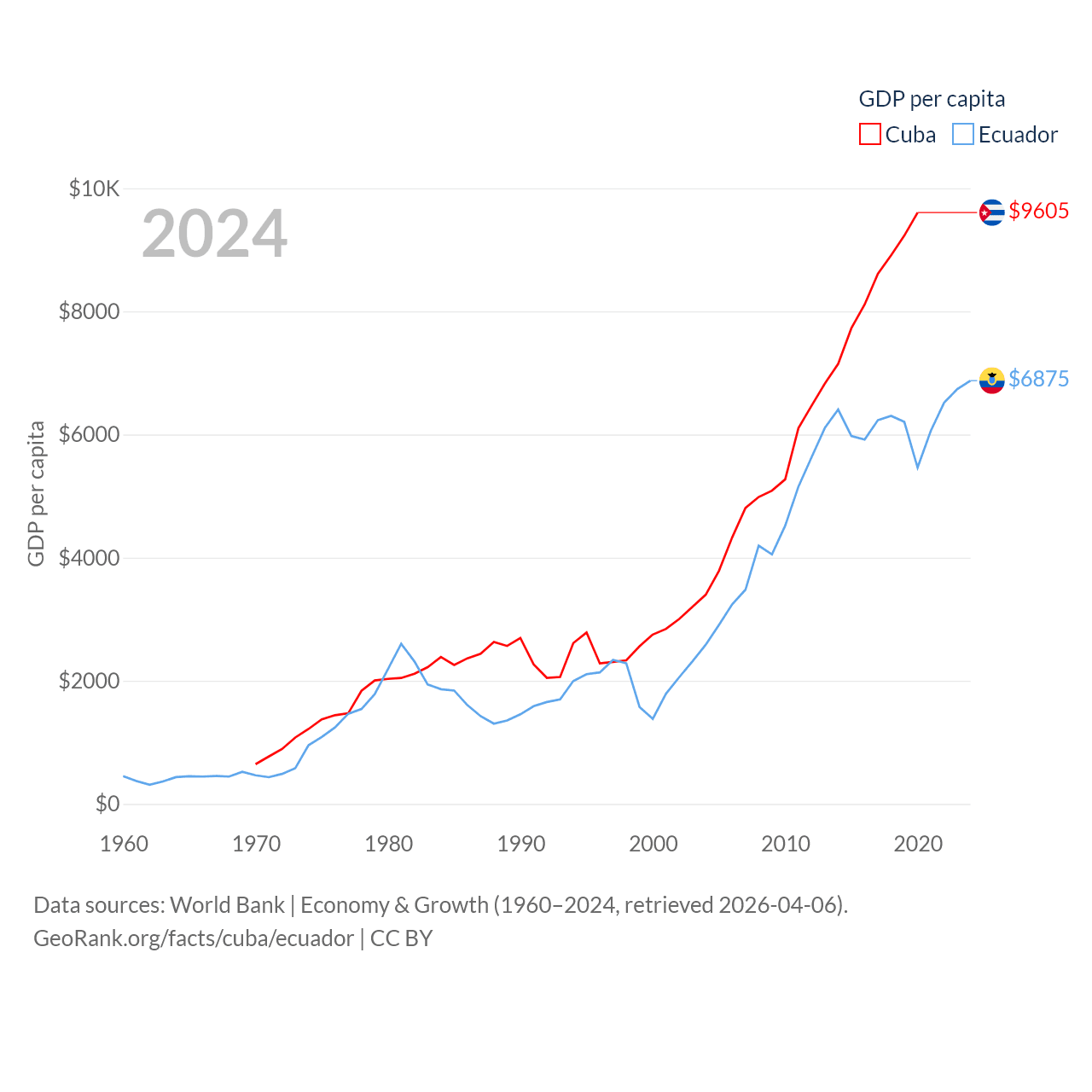 By GDP, Cuba ranks 69/197 ($107B) and Ecuador ranks 62/197 ($125B). By GDP per capita, Cuba ranks 86/197 ($9,605), while Ecuador ranks 103/197 ($6,875).