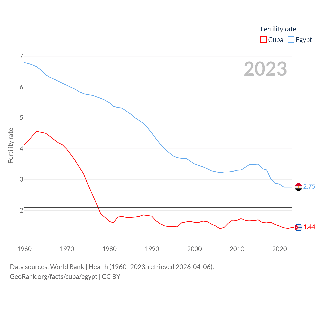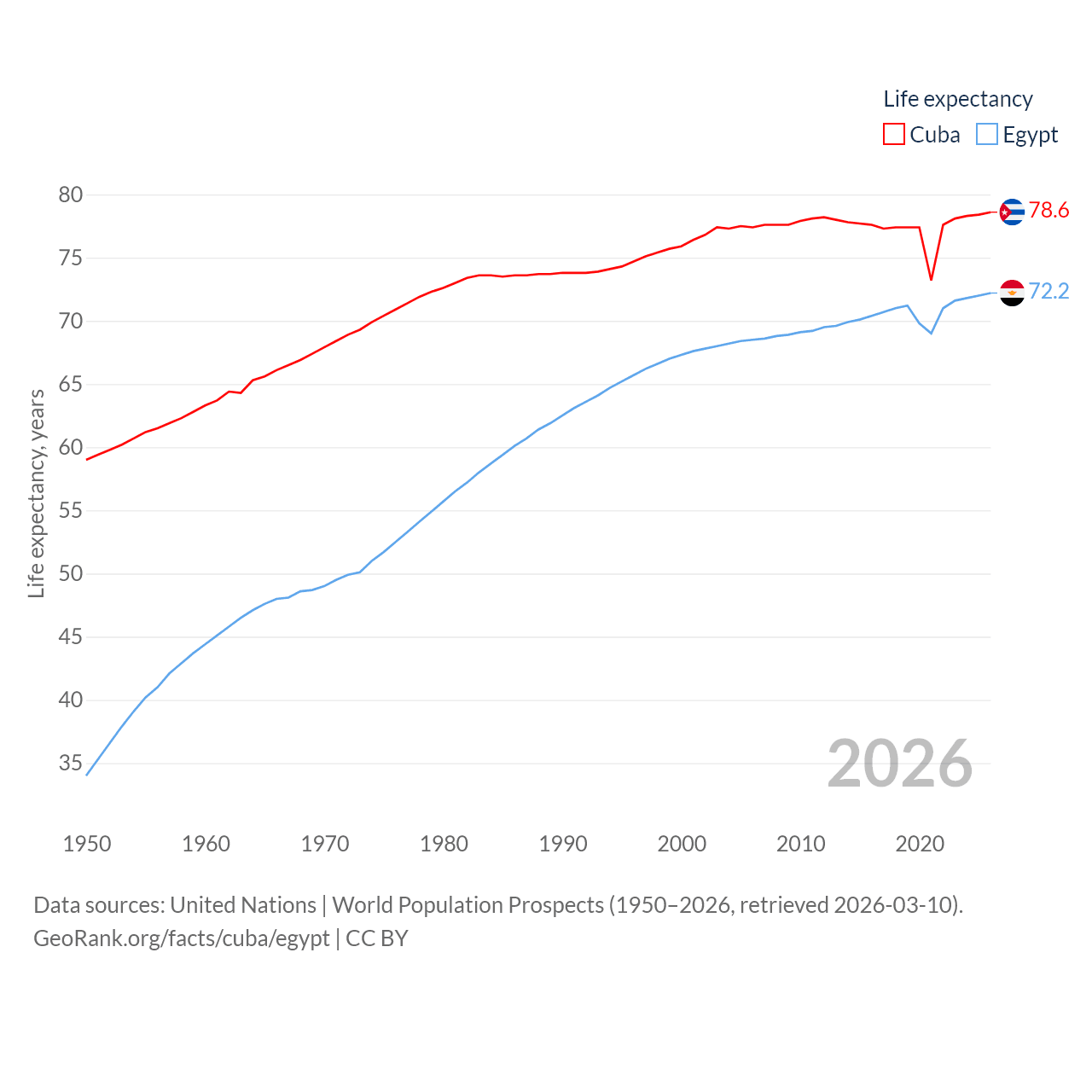 Cuba has a population of 11M (ranked 87/197), compared with 117M in Egypt (ranked 13/197). Cuba's land area is 40,077 sq mi versus 384,345 sq mi for Egypt (ranked 103rd vs. 29th).