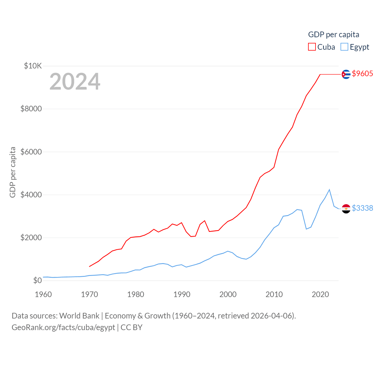 By GDP, Cuba ranks 69/197 ($107B) and Egypt ranks 41/197 ($389B). By GDP per capita, Cuba ranks 86/197 ($9,605), while Egypt ranks 138/197 ($3,338).