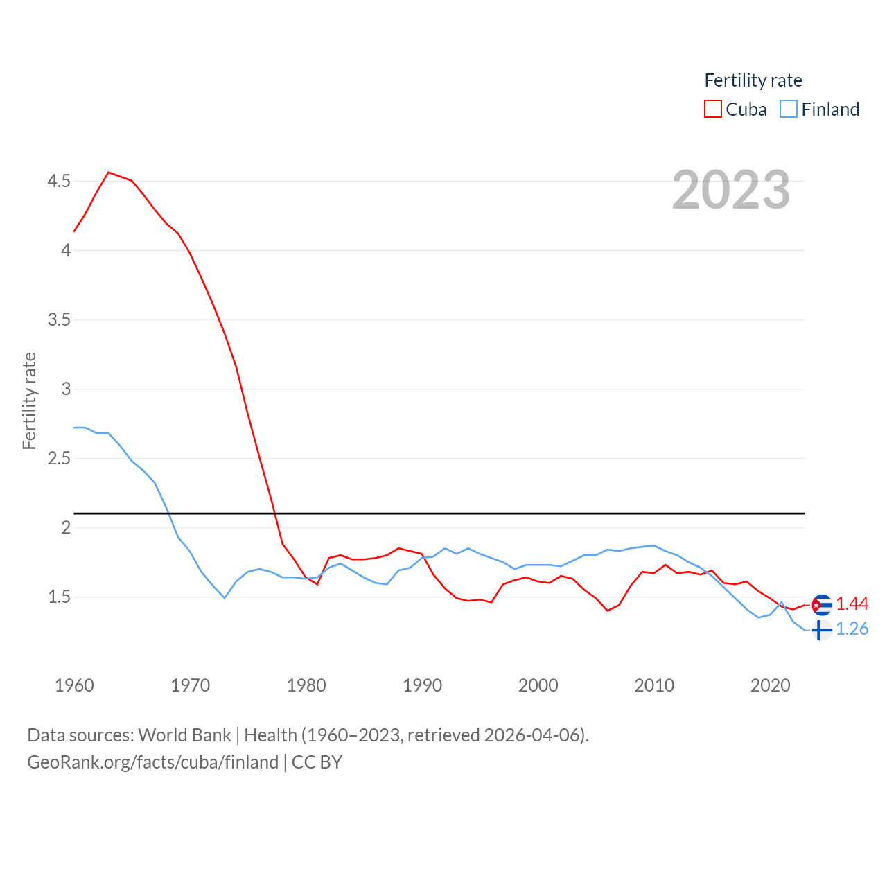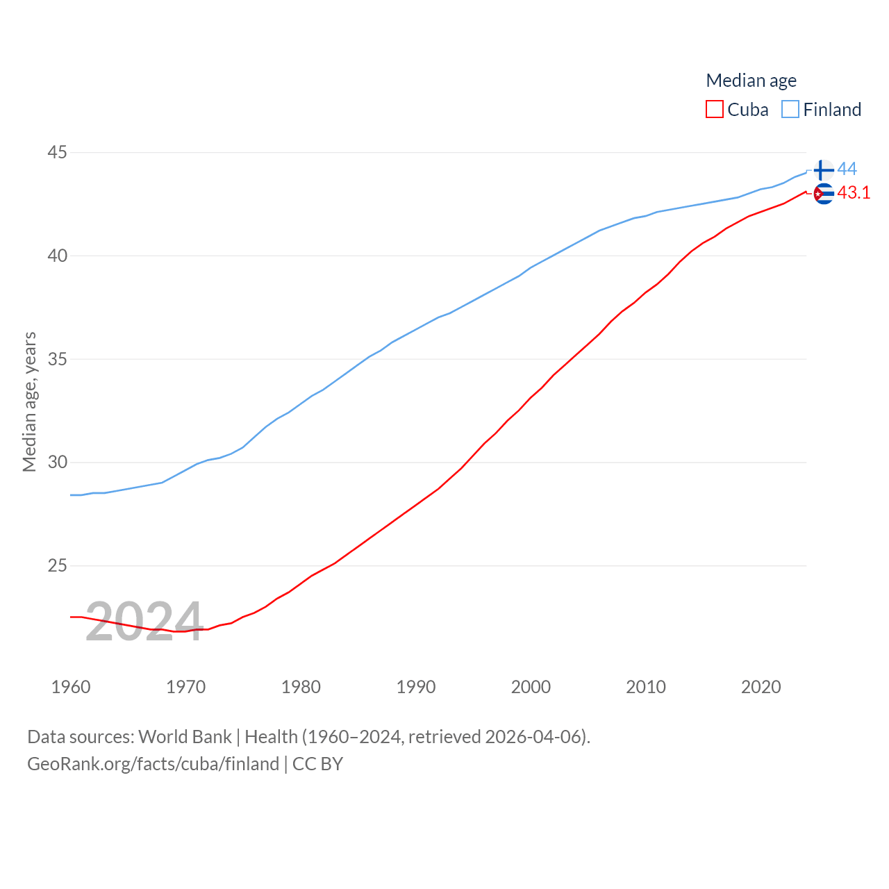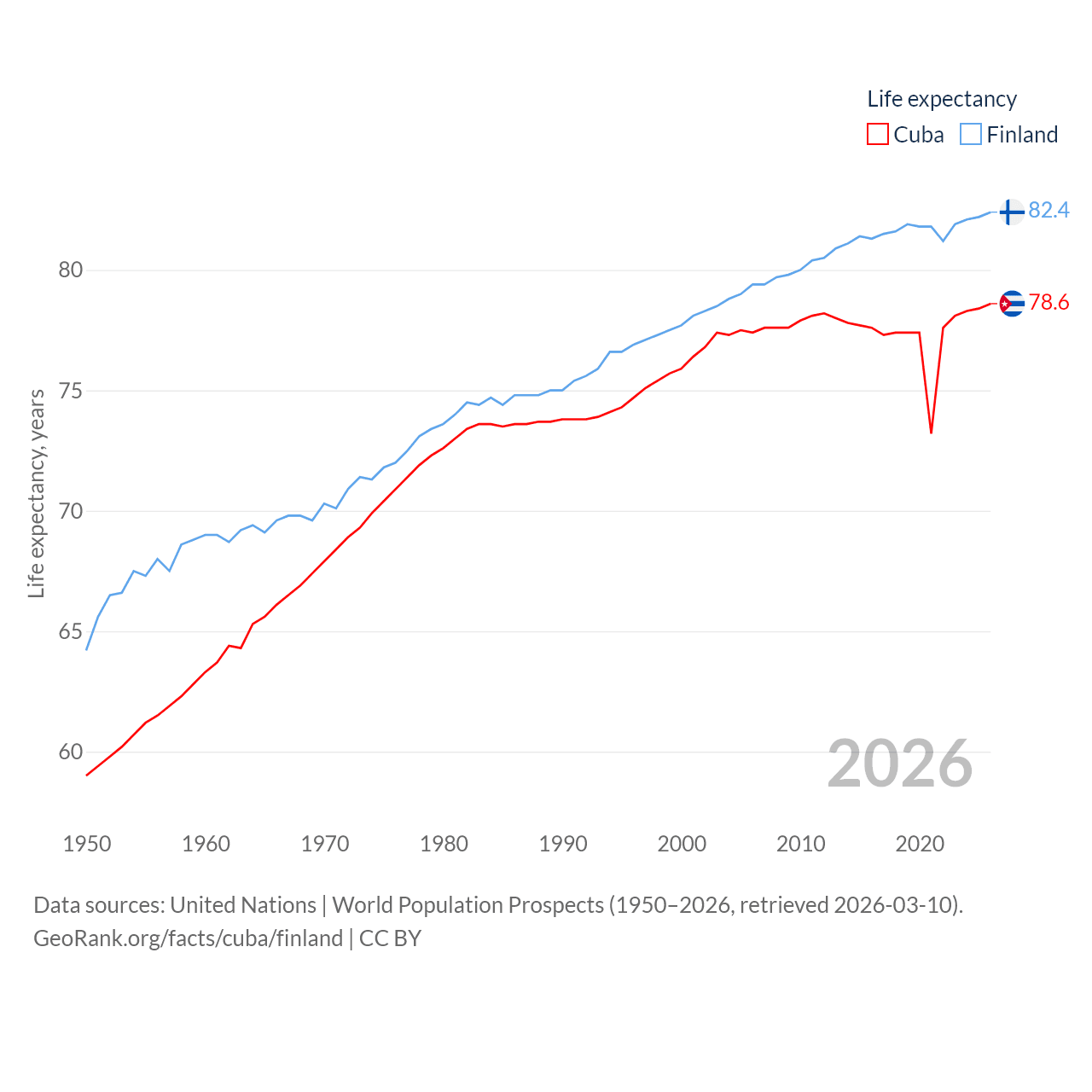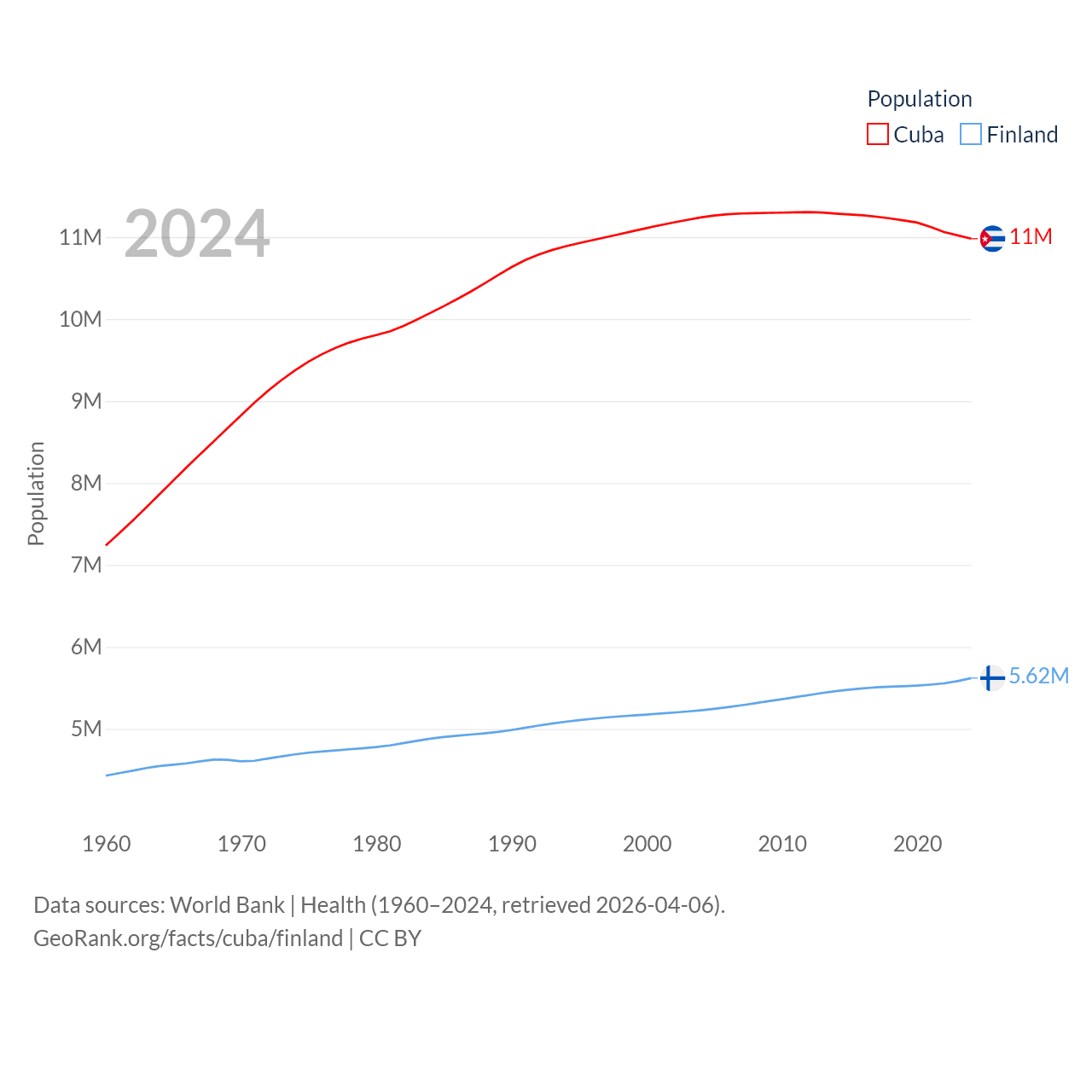 Cuba has a population of 11M (ranked 87/197), compared with 5.62M in Finland (ranked 116/197). Cuba's land area is 40,077 sq mi versus 117,360 sq mi for Finland (ranked 103rd vs. 70th).