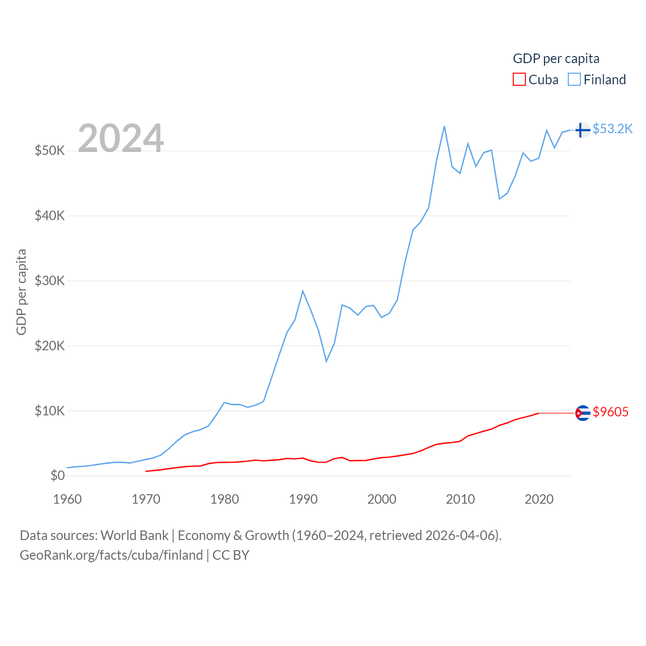By GDP, Cuba ranks 69/197 ($107B) and Finland ranks 47/197 ($299B). By GDP per capita, Cuba ranks 86/197 ($9,605), while Finland ranks 23/197 ($53,150).