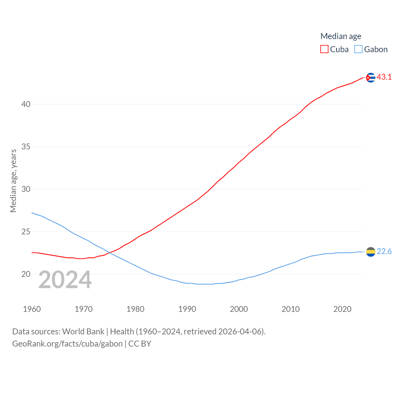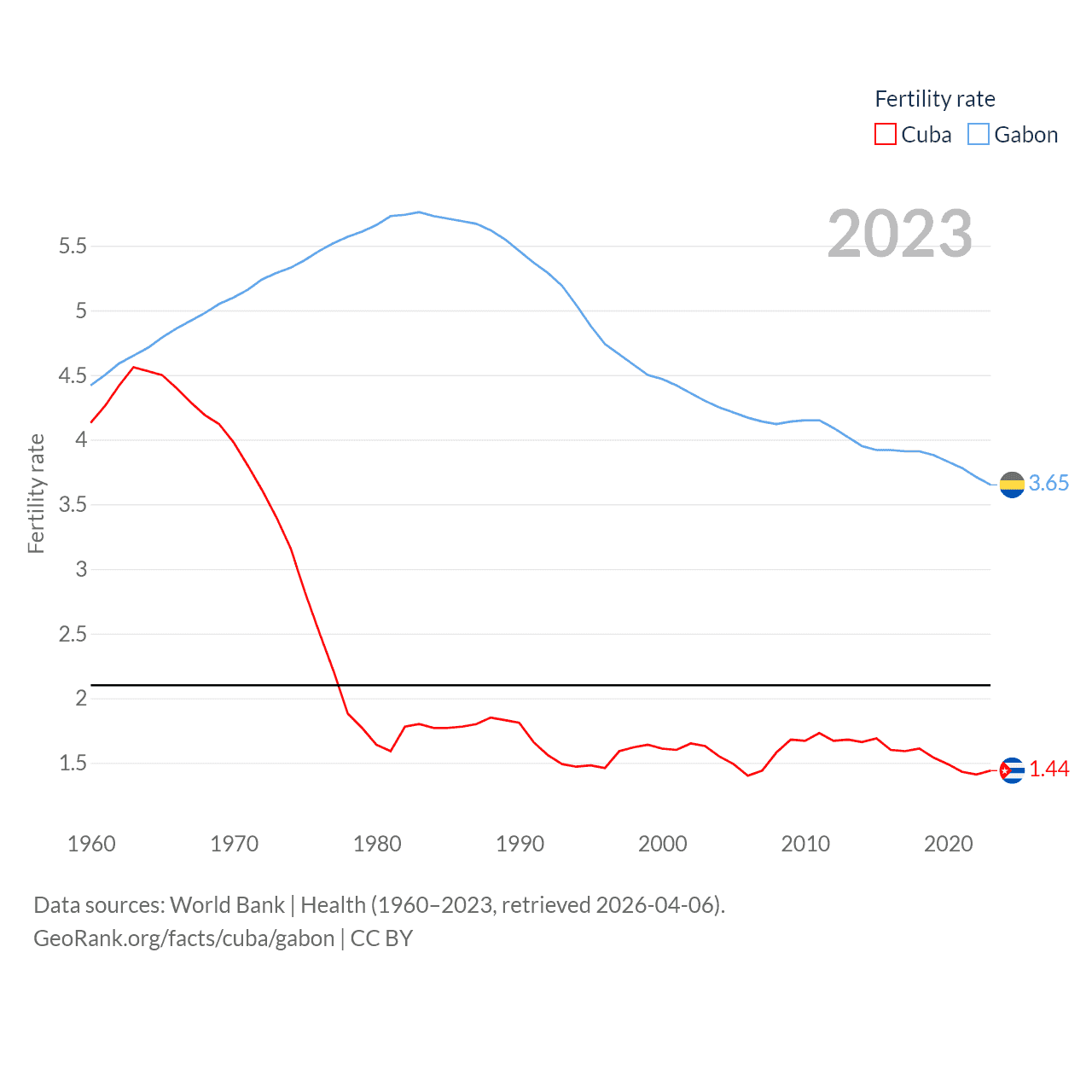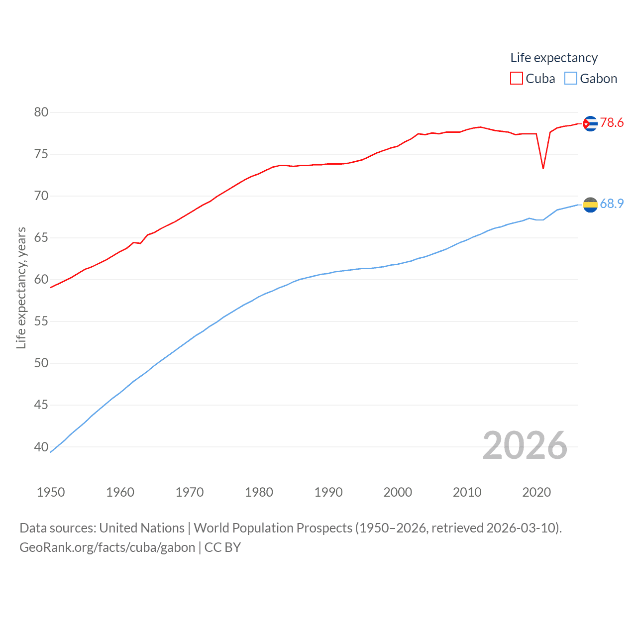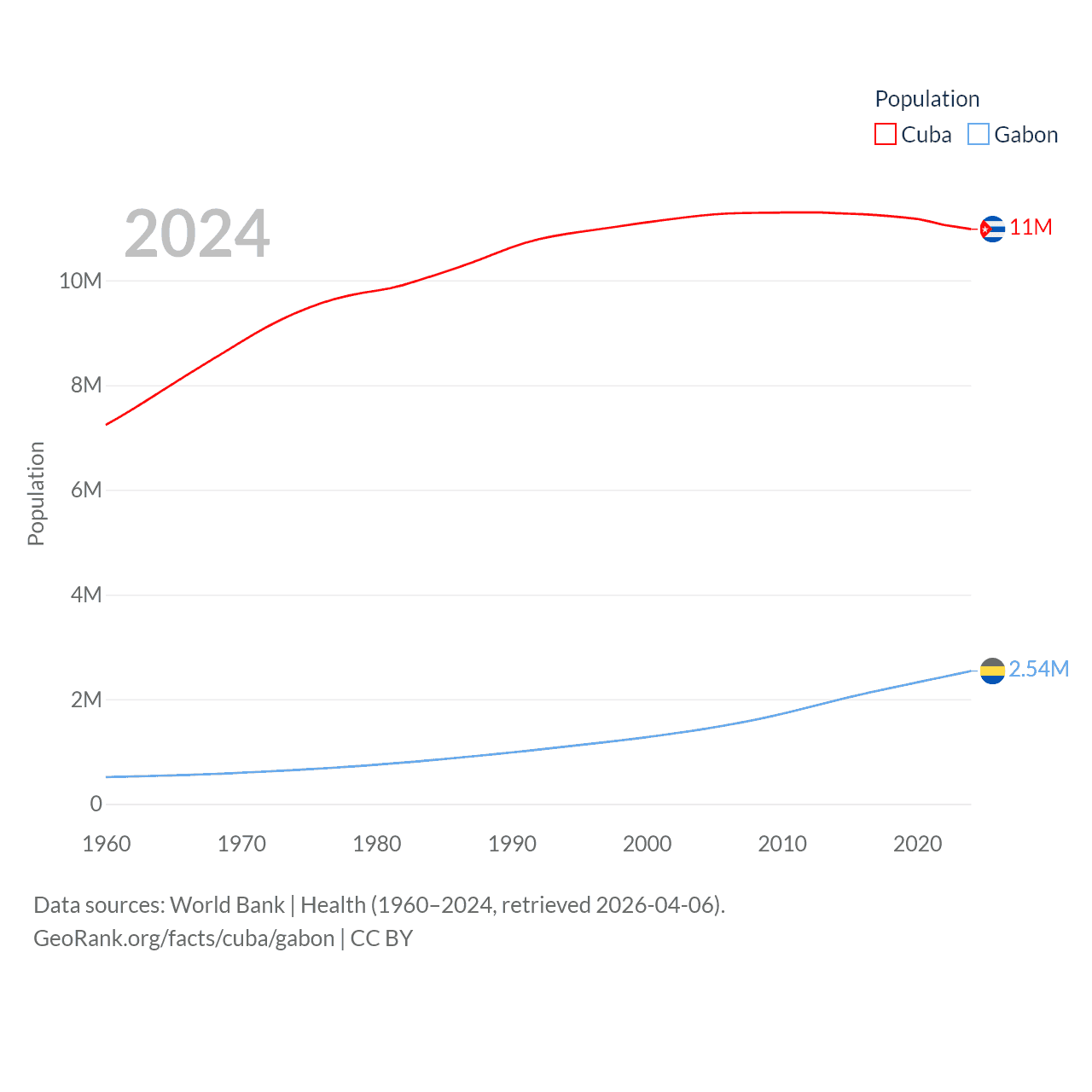 Cuba has a population of 11M (ranked 87/197), compared with 2.54M in Gabon (ranked 141/197). Cuba's land area is 40,077 sq mi versus 99,487 sq mi for Gabon (ranked 103rd vs. 75th).