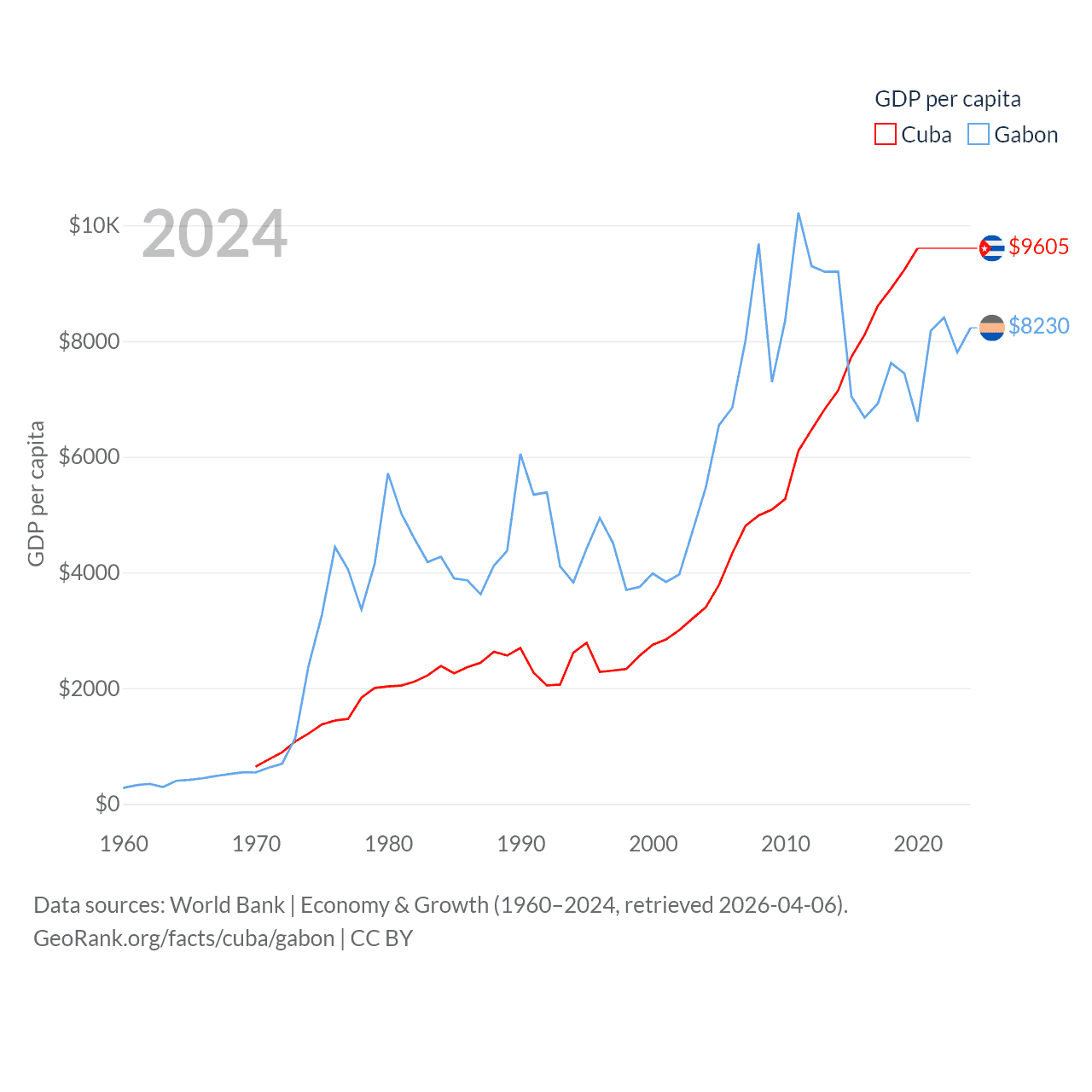 By GDP, Cuba ranks 69/197 ($107B) and Gabon ranks 127/197 ($20.9B). By GDP per capita, Cuba ranks 86/197 ($9,605), while Gabon ranks 93/197 ($8,230).
