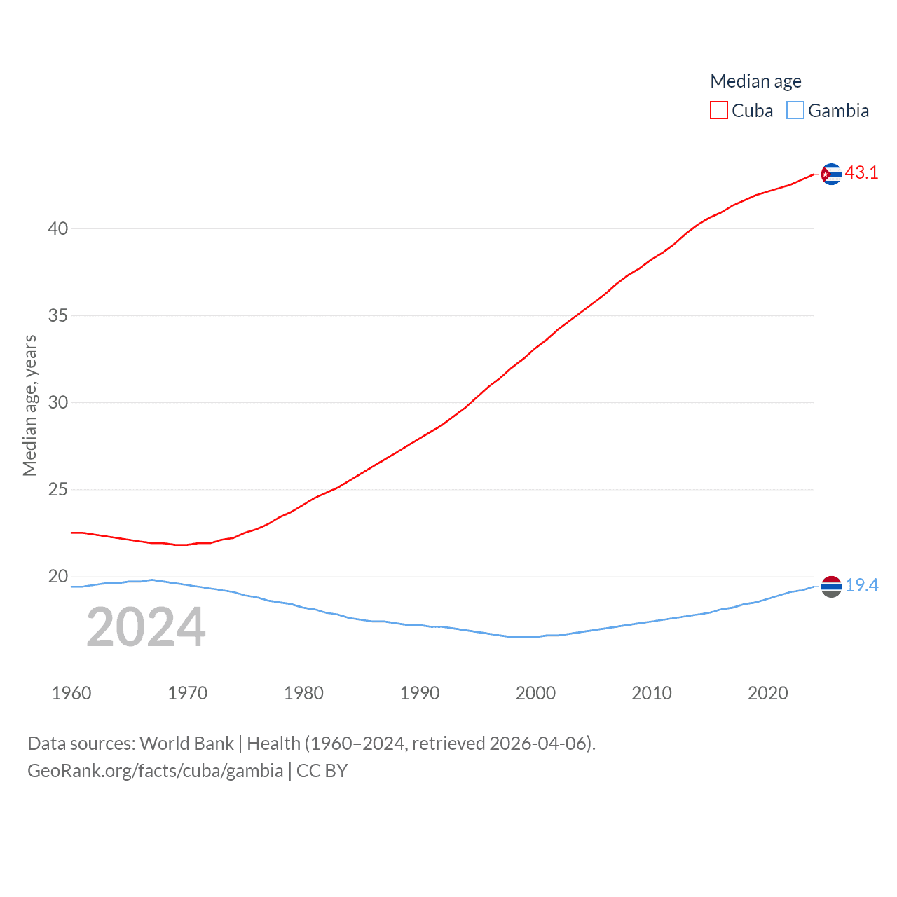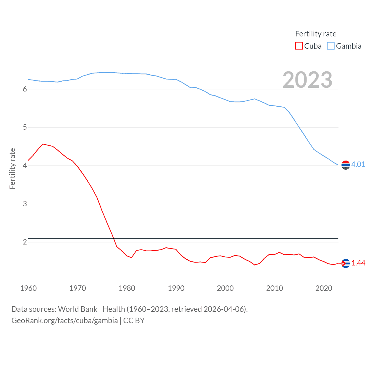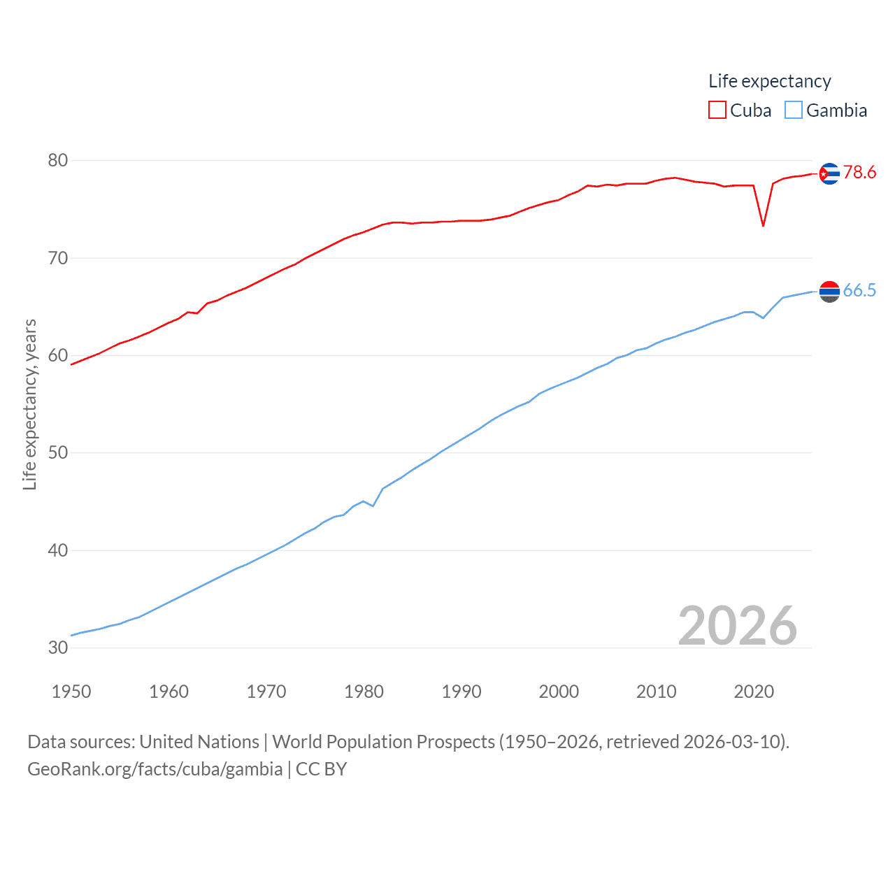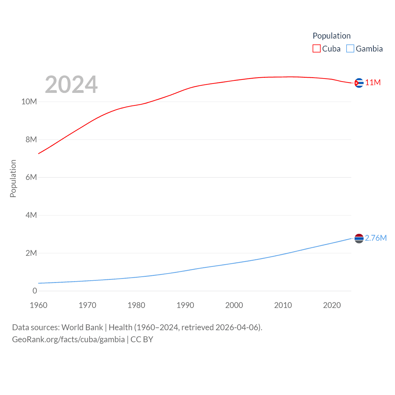 Cuba has a population of 11M (ranked 87/197), compared with 2.76M in The Gambia (ranked 140/197). Cuba's land area is 40,077 sq mi versus 3,907 sq mi for The Gambia (ranked 103rd vs. 161st).