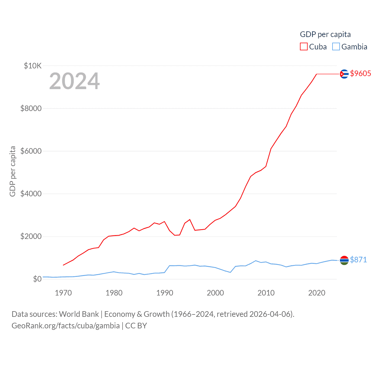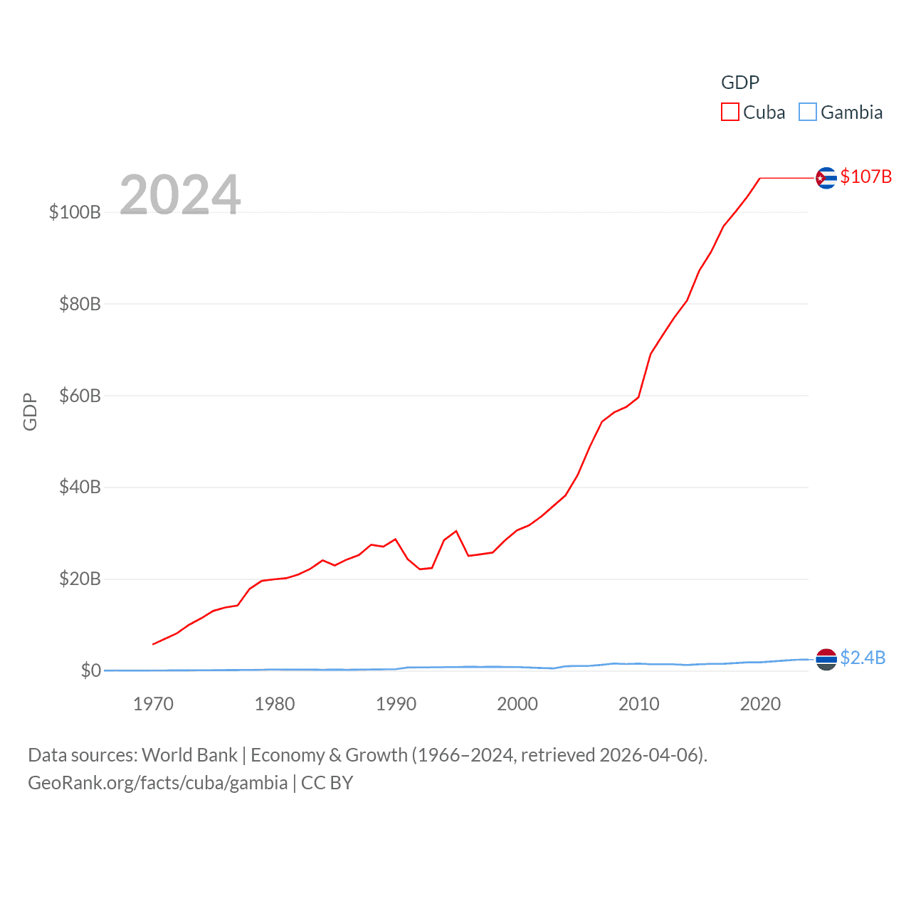 By GDP, Cuba ranks 69/197 ($107B) and The Gambia ranks 174/197 ($2.4B). By GDP per capita, Cuba ranks 86/197 ($9,605), while The Gambia ranks 183/197 ($871).