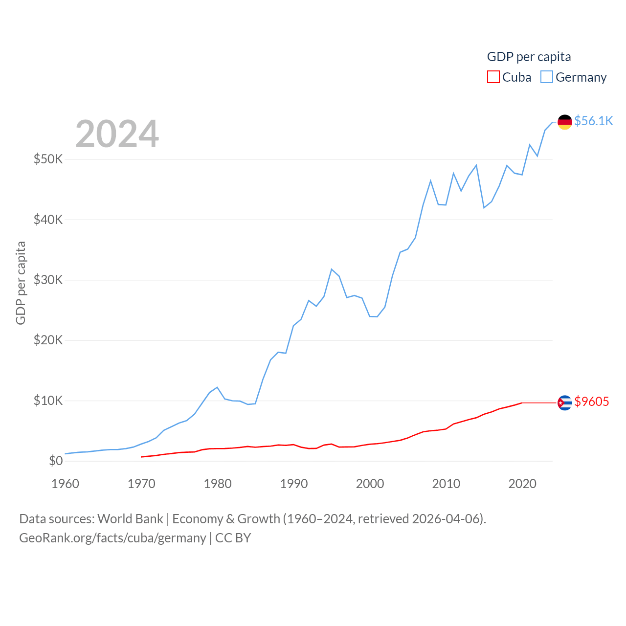 By GDP, Cuba ranks 69/197 ($107B) and Germany ranks 3/197 ($4.69T). By GDP per capita, Cuba ranks 86/197 ($9,605), while Germany ranks 19/197 ($56,104).