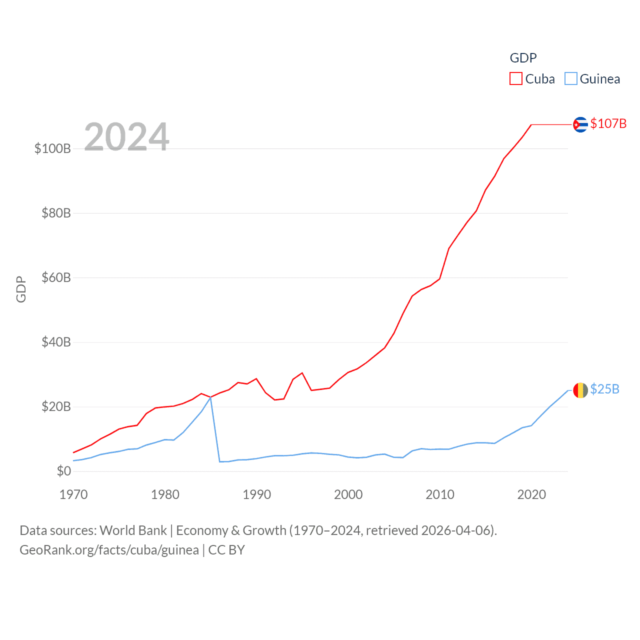 By GDP, Cuba ranks 69/197 ($107B) and Guinea ranks 118/197 ($25B). By GDP per capita, Cuba ranks 86/197 ($9,605), while Guinea ranks 160/197 ($1,695).
