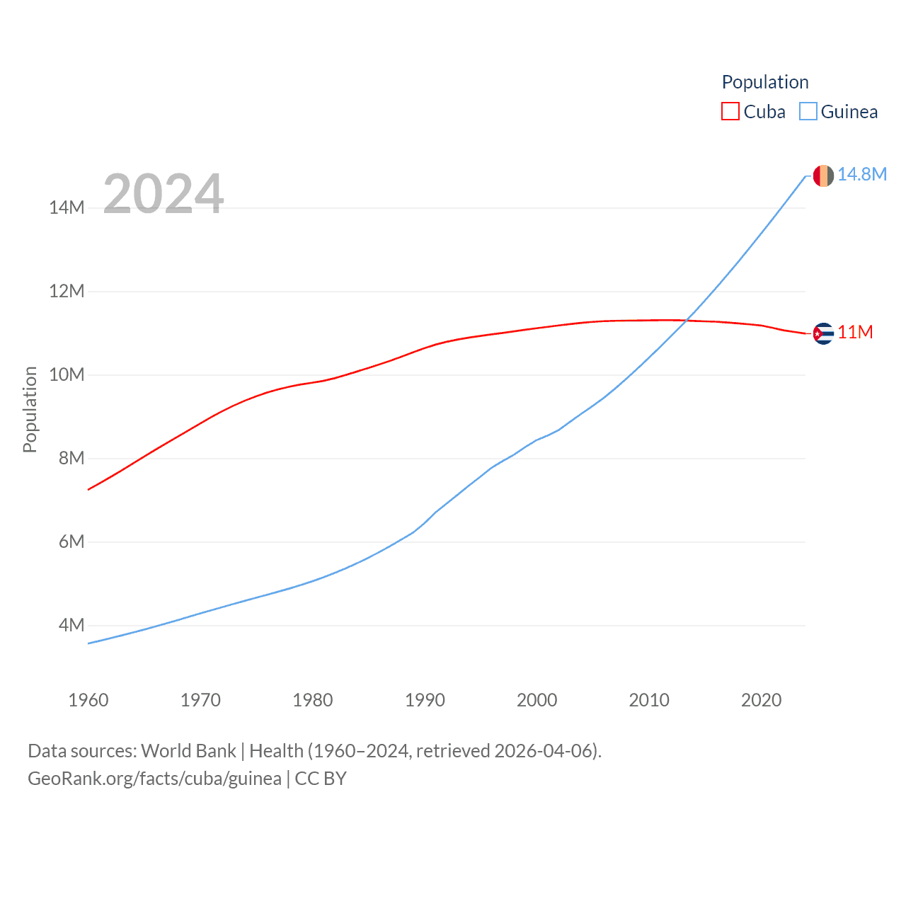 Cuba has a population of 11M (ranked 87/197), compared with 14.8M in Guinea (ranked 75/197). Cuba's land area is 40,077 sq mi versus 94,873 sq mi for Guinea (ranked 103rd vs. 77th).