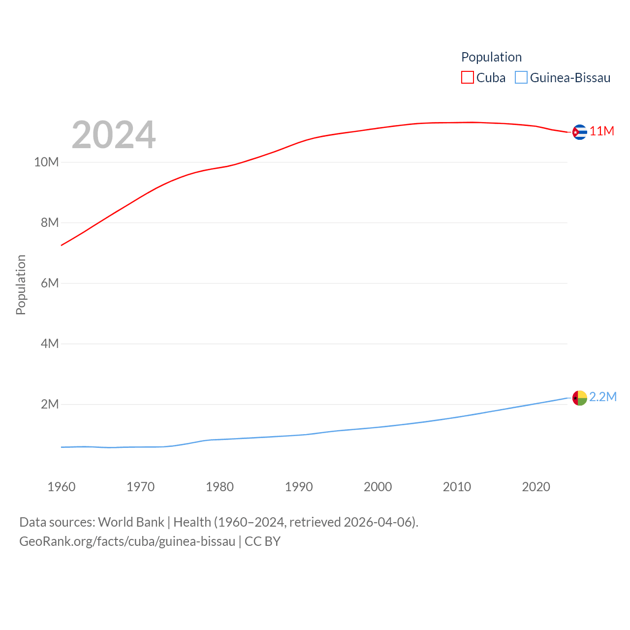 Cuba has a population of 11M (ranked 87/197), compared with 2.2M in Guinea-Bissau (ranked 146/197). Cuba's land area is 40,077 sq mi versus 10,857 sq mi for Guinea-Bissau (ranked 103rd vs. 139th).