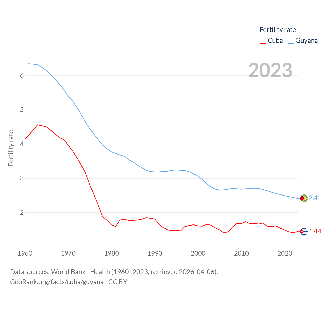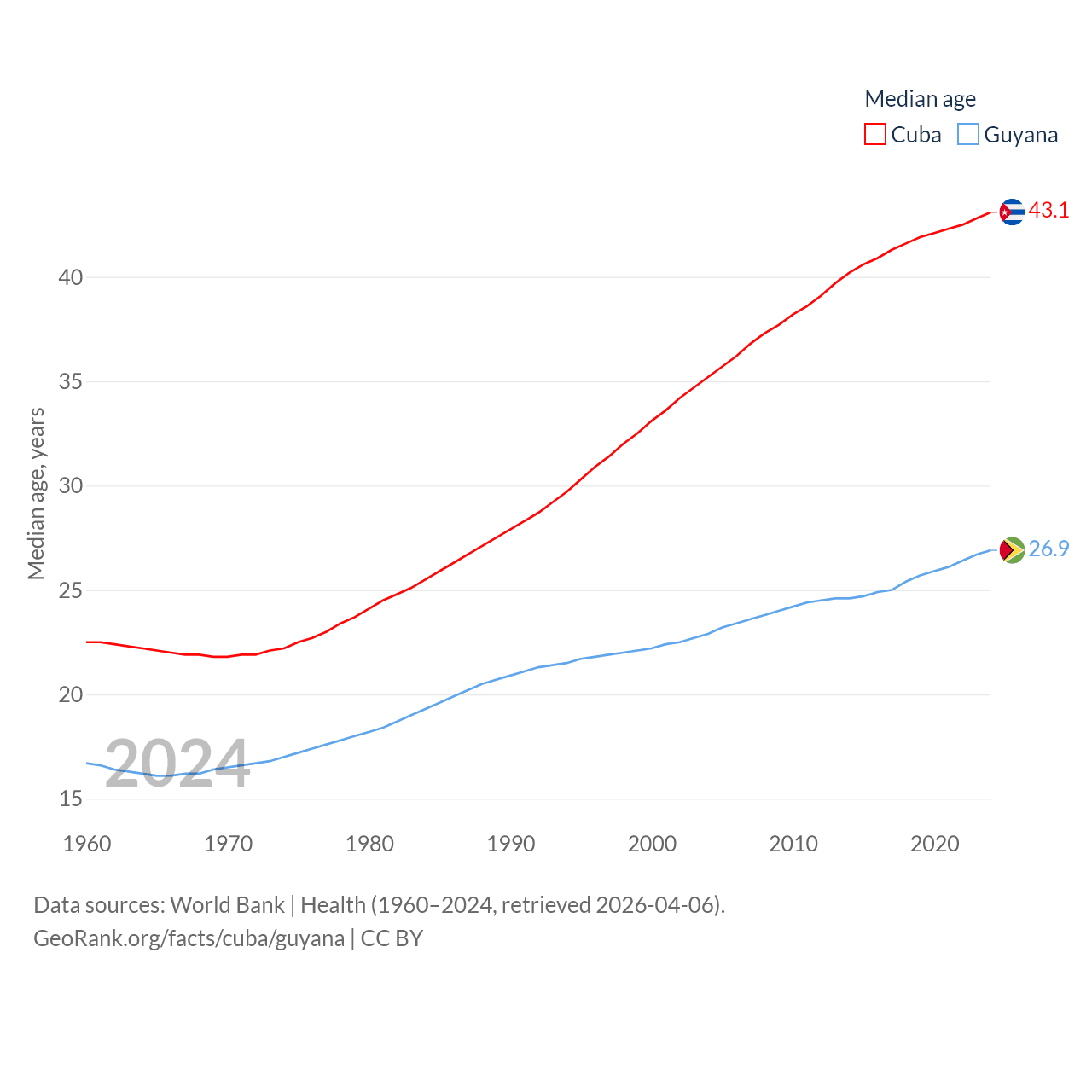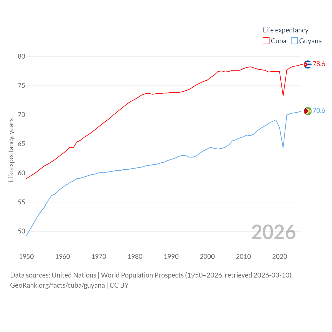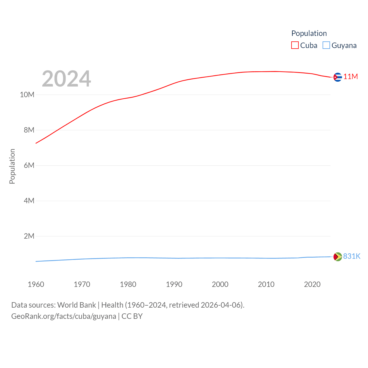 Cuba has a population of 11M (ranked 87/197), compared with 831K in Guyana (ranked 161/197). Cuba's land area is 40,077 sq mi versus 81,522 sq mi for Guyana (ranked 103rd vs. 82nd).