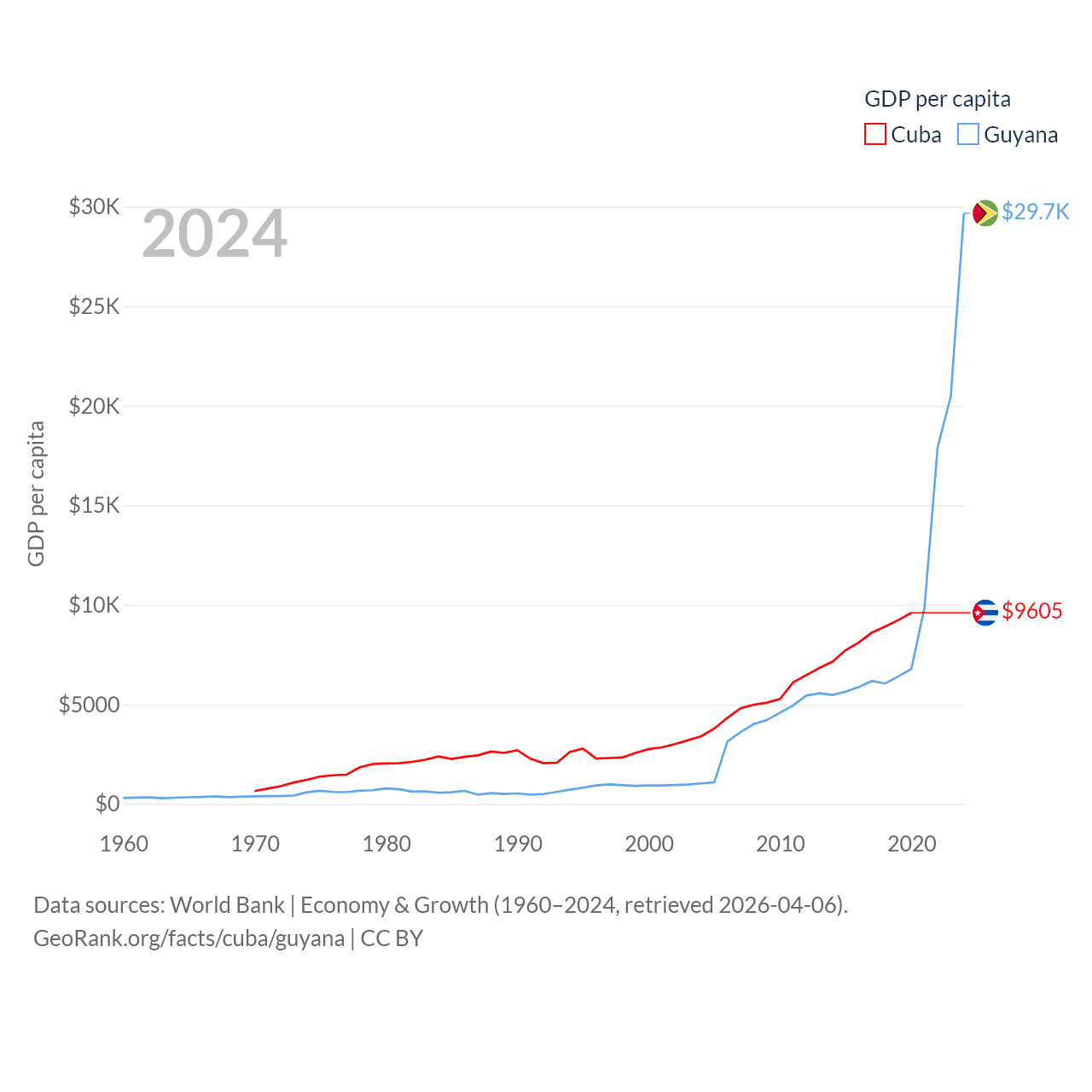 By GDP, Cuba ranks 69/197 ($107B) and Guyana ranks 120/197 ($24.7B). By GDP per capita, Cuba ranks 86/197 ($9,605), while Guyana ranks 41/197 ($29,675).