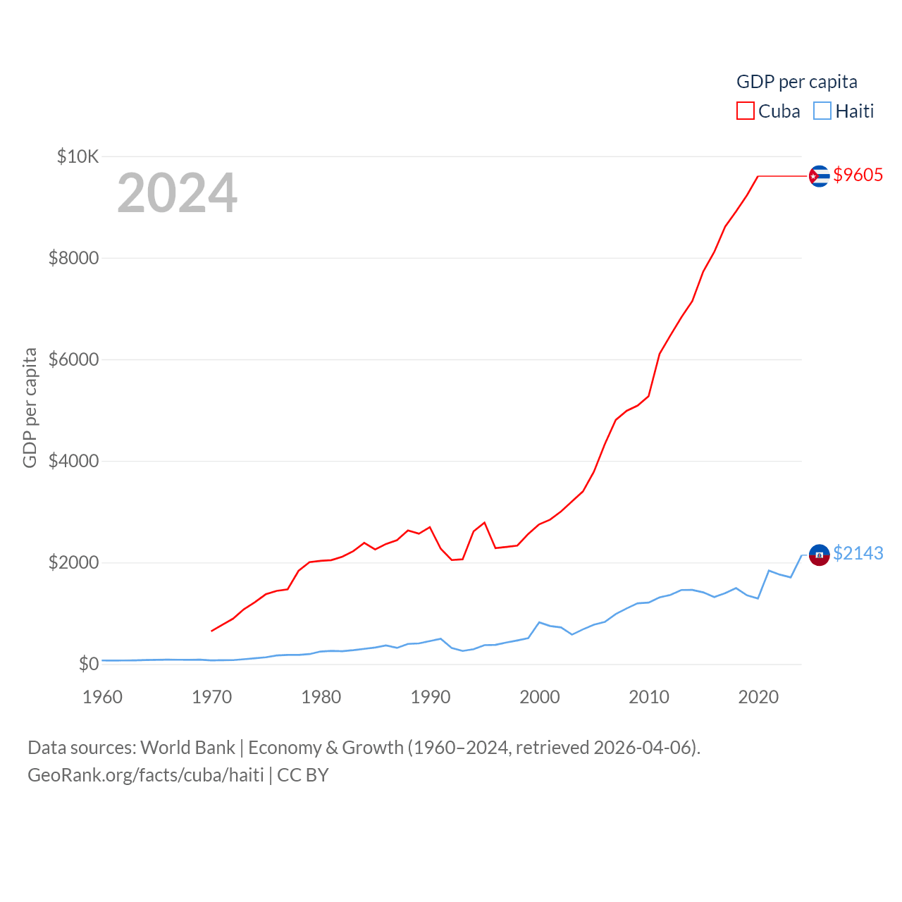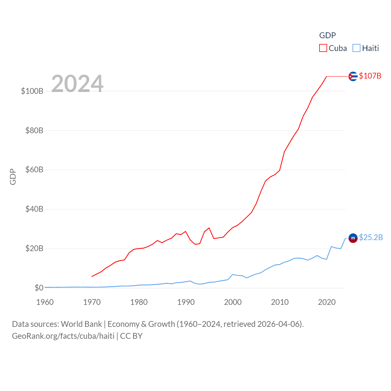 By GDP, Cuba ranks 69/197 ($107B) and Haiti ranks 117/197 ($25.2B). By GDP per capita, Cuba ranks 86/197 ($9,605), while Haiti ranks 153/197 ($2,143).
