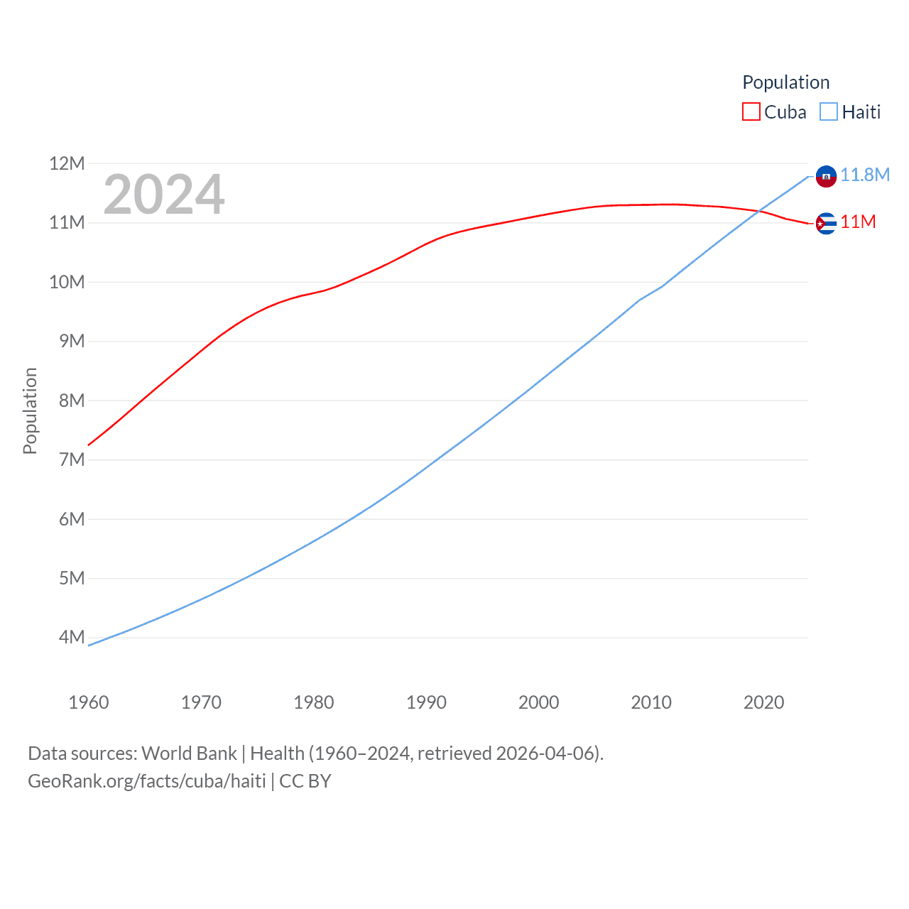 Cuba has a population of 11M (ranked 87/197), compared with 11.8M in Haiti (ranked 83/197). Cuba's land area is 40,077 sq mi versus 10,641 sq mi for Haiti (ranked 103rd vs. 142nd).