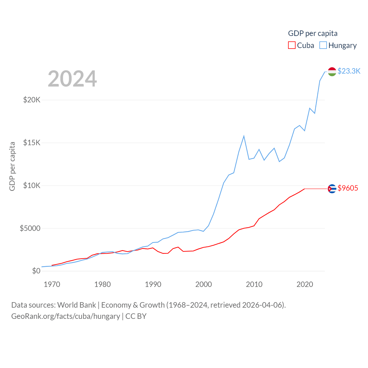 By GDP, Cuba ranks 69/197 ($107B) and Hungary ranks 55/197 ($223B). By GDP per capita, Cuba ranks 86/197 ($9,605), while Hungary ranks 55/197 ($23,292).